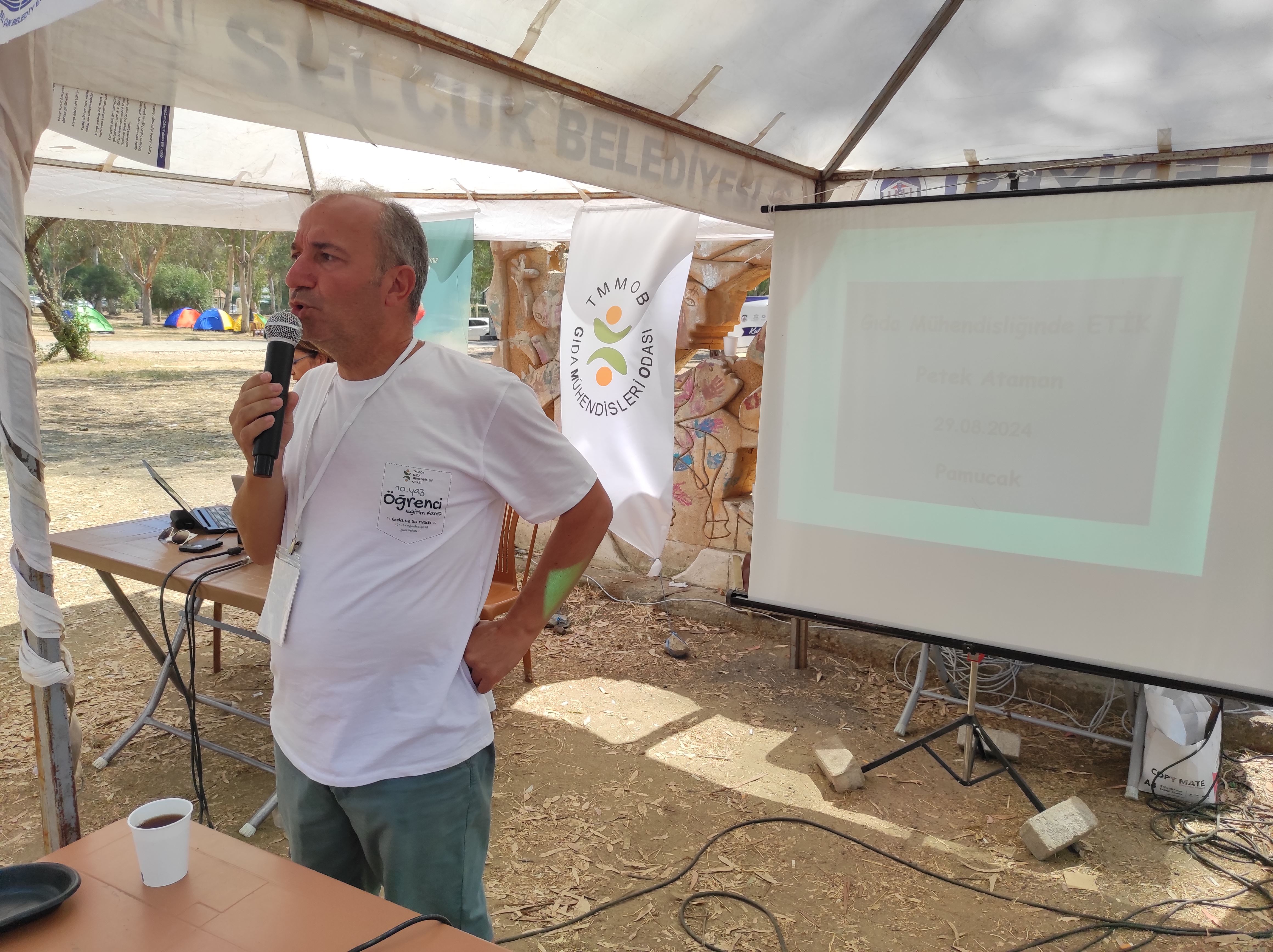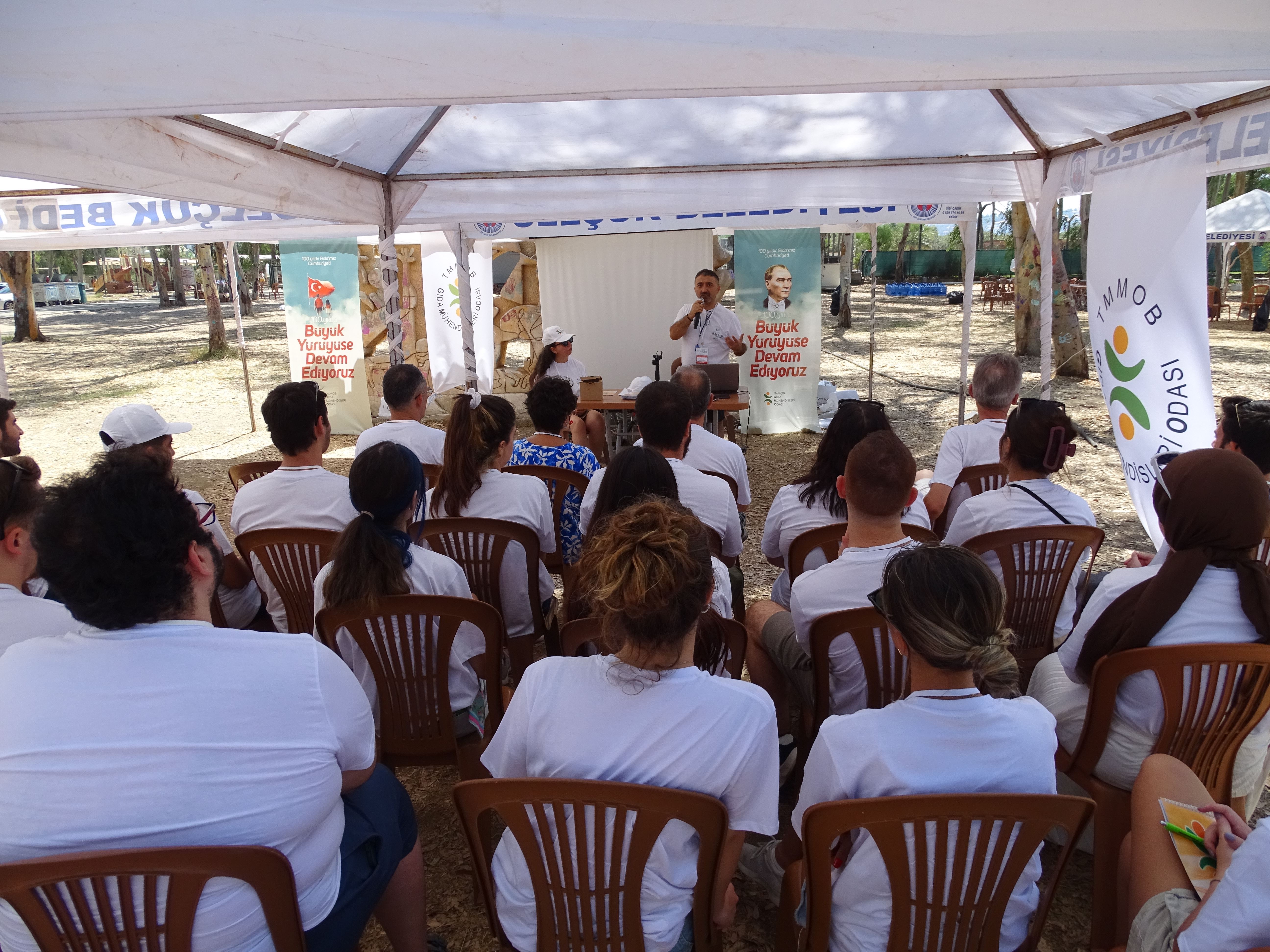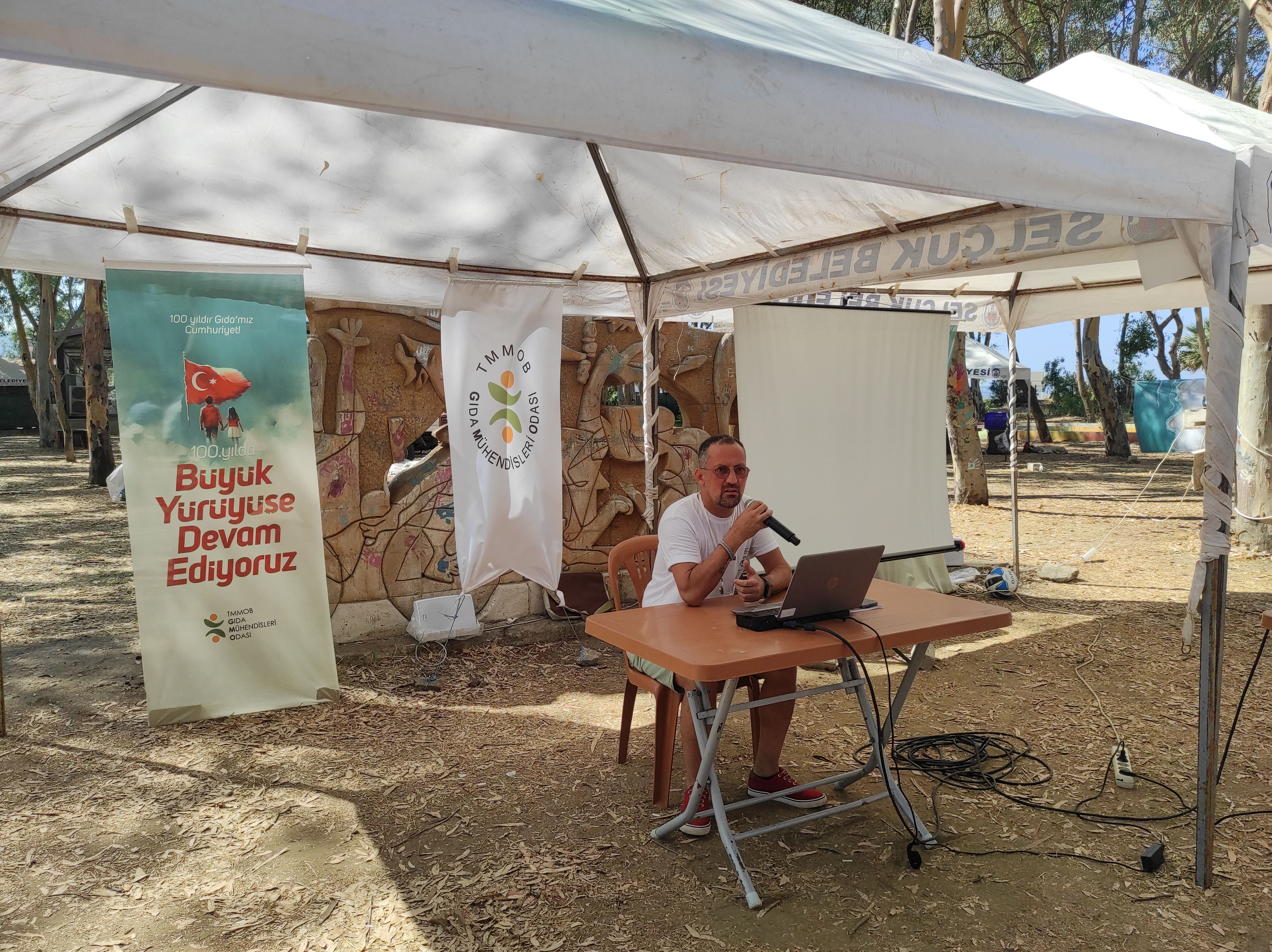Odamız Yönetim Kurulu Başkanı Yaşar Üzümcü`nün açılış konuşması yaptığı Yaz Eğitim kampımız boyunca; Yönetim Kurulu Başkanımız Yaşar Üzümcü, Yönetim Kurulu Sayman Üyemiz Tufan Gündüzalp ve Yönetim Kuru Üyemiz Uğur Toprak "TMMOB, Gıda MO ve Meslek Örgütlülüğü", Öğrenci Koordinasyon Kurulu Üyemiz Gamze Atar Kayabaşı'nın "ÖKK Öğrenci Temsilciliği Çalışmaları ve Bilgilendirme", Yönetim Kurulu Üyemiz Uğur Toprak "Gıda ve Su Hakkı", İstanbul Şube Yönetim Kurulu Üyemiz Ebru Akdağ "Gıda Hurafeleri Örnekleri ve Gıda Mühendislerinin Yaklaşımı", Onur Kurulu Üyemiz Petek Ataman "Gıda Mühendisliğinde Etik", Prof. Dr. Ufuk Yücel "Şarap Kültürü ve Şarap Üretim Teknolojileri", İzmir Şube Eski Yönetim Kurulu Üyesi İnci Özer "Zeytin ve Zeytinyağı Kısa Anlatım ve Tadımı" konusunda öğrenci arkadaşlarımızı bilgilendirerek, söyleşiler gerçekleştirdiler.