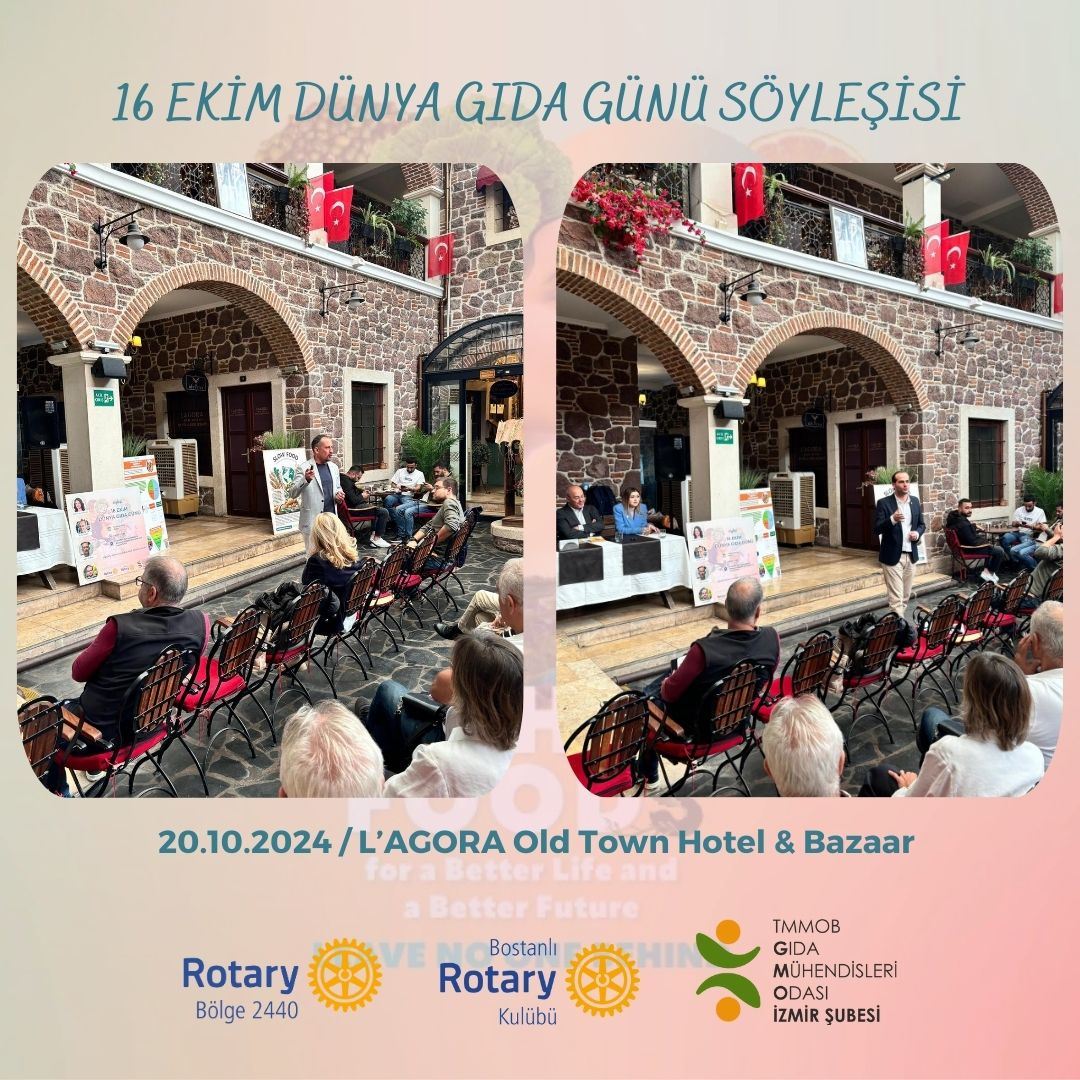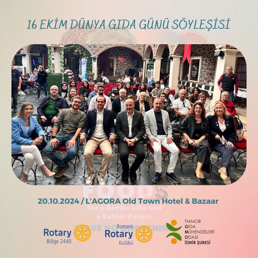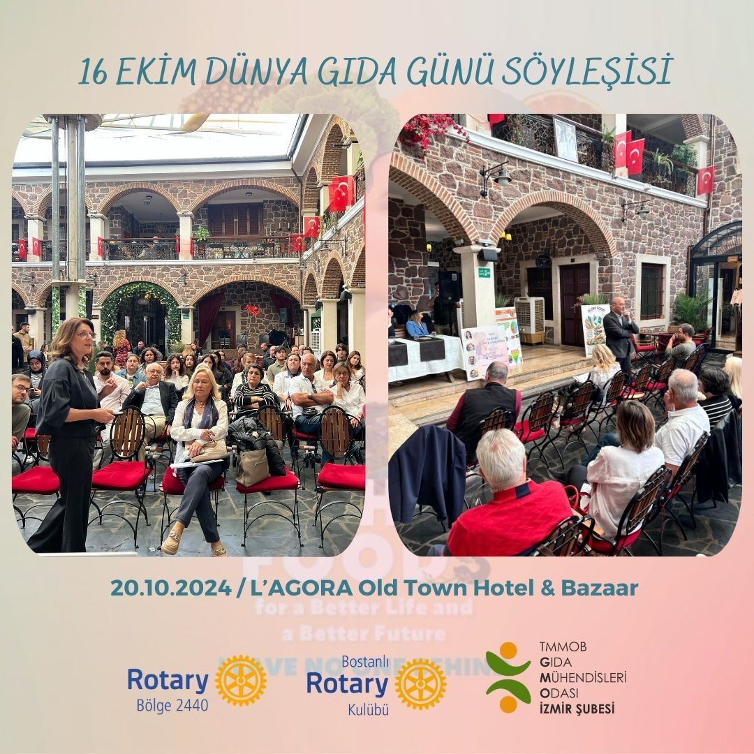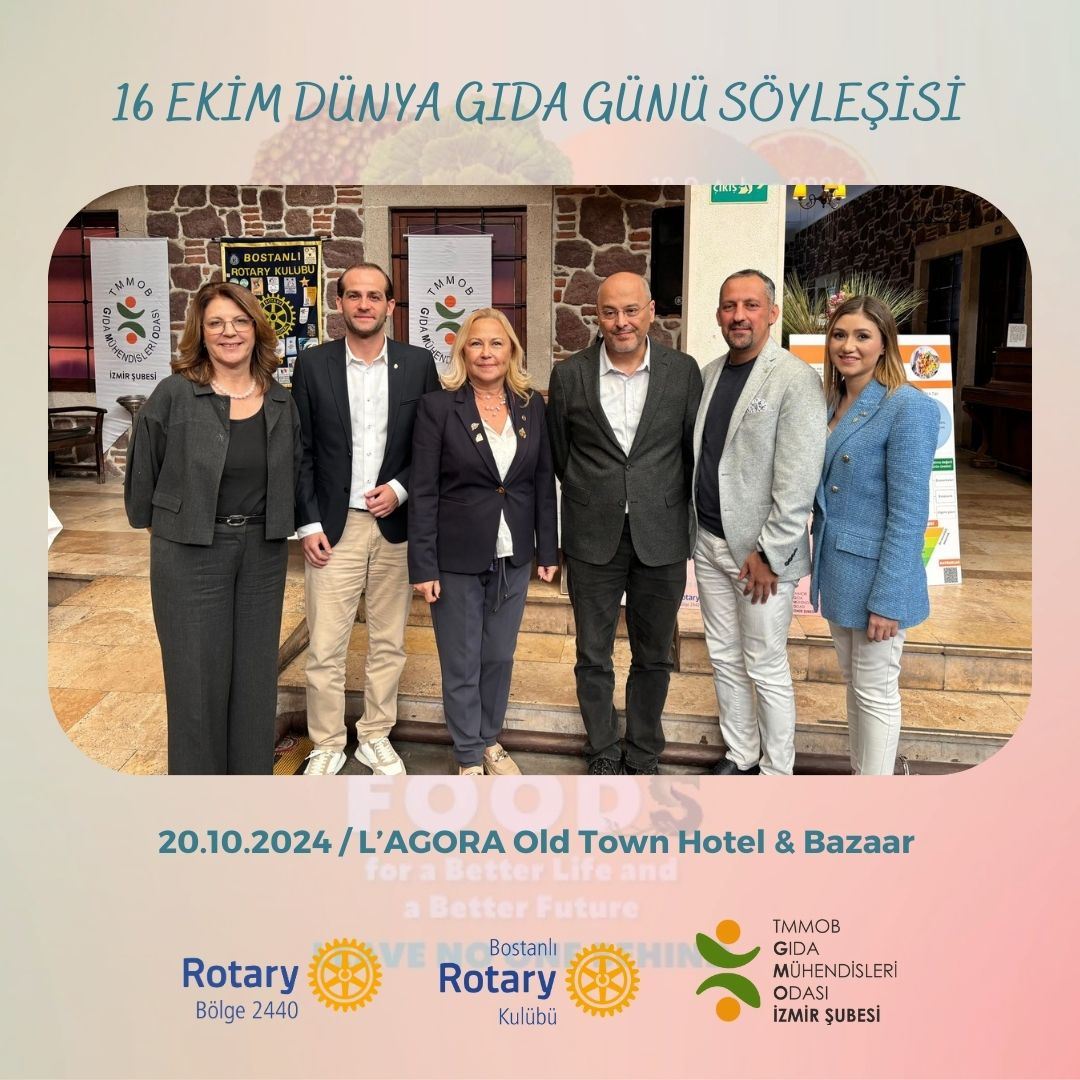 16 Ekim Dünya Gıda Günü etkinliklerimiz kapsamında Rotary Bölge 2440 ve Bostanlı Rotary Kulübünün destekleriyle bir söyleşi gerçekleştirdik. 20 Ekim 2024 Cumartesi günü L’agora Old Town Hotel & Bazaar’da gerçekleşen ve kolaylaştırıcılığını Şube Yönetim Kurulu Yedek Üyemiz Özge KESKİNOĞLU'nun yürüttüğü söyleşide; Ege Üniversitesi Gıda Mühendisliği Bölümünden Prof. Nurcan KOCA “Gıda Üretimi ve Tüketiminde Sürdürülebilirlik Yaklaşımı”nı, Dr. Akademisyen Dr. Bülent ŞIK "Çocuk Beslenmesi ve Okul Yemeği Koalisyonu"nu, Oda Yönetim Kurulu Üyemiz İ. Uğur TOPRAK "Gıda ve Su Hakkı"nı, Şube Yönetim Kurulu Başkanımız Ö. Ulaş KIRIM "Gıda İsrafı"nı anlattı, merak edilenleri yanıtladı.