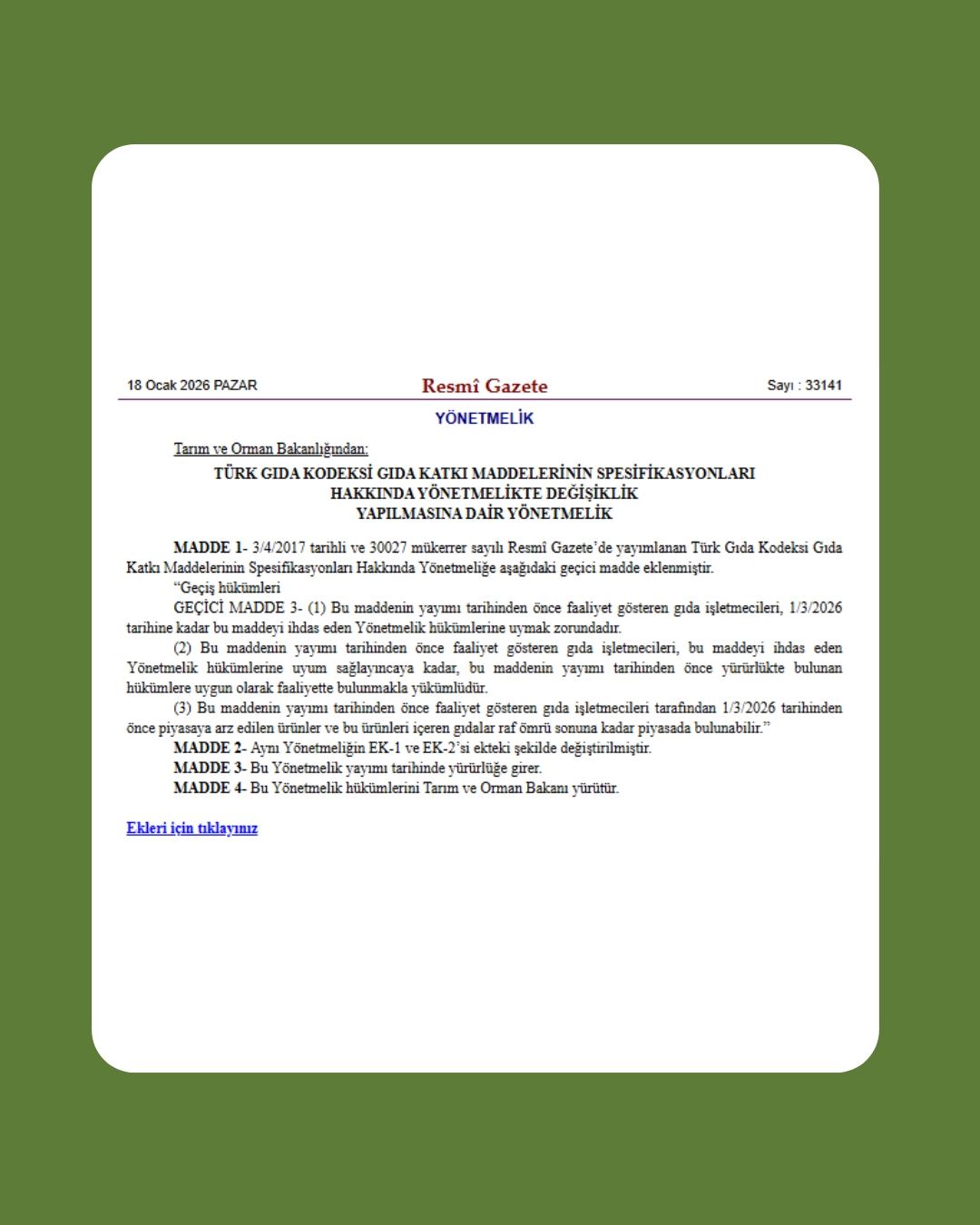 📢 18.01.2026 TARİH VE 33141 SAYILI RESMİ GAZETE / TÜRK GIDA KODEKSİ GIDA KATKI MADDELERİNİN SPESİFİKASYONLARI HAKKINDA YÖNETMELİKTE DEĞİŞİKLİK YAPILMASINA DAİR YÖNETMELİK