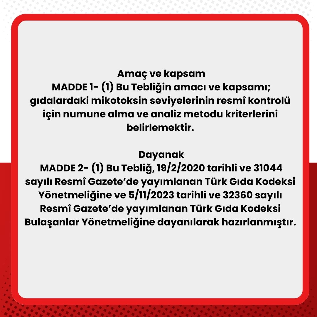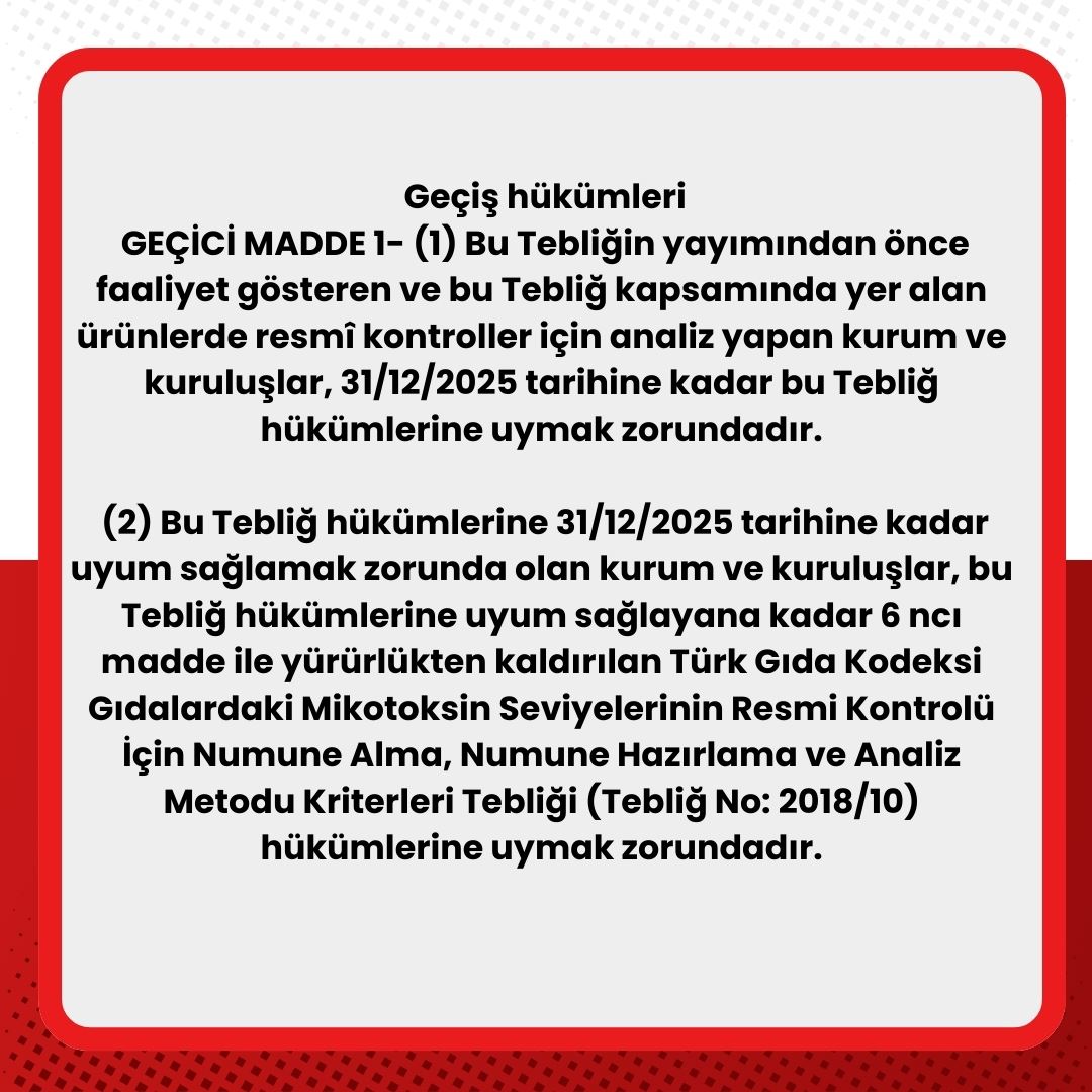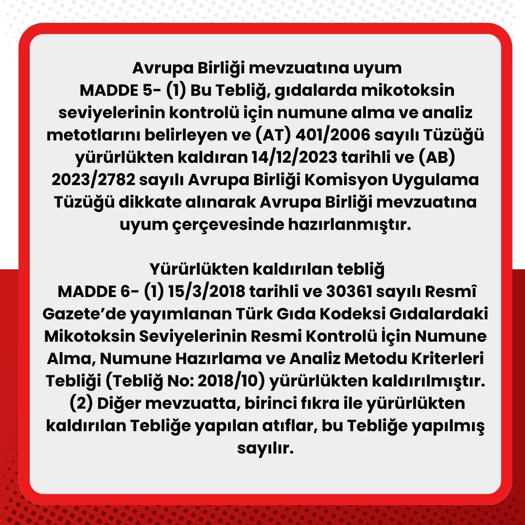 Tarım ve Orman Bakanlığı tarafından, Türk Gıda Kodeksi Gıdalardaki Mikotoksin Seviyelerinin Resmî Kontrolü İçin Numune Alma Ve Analiz Metodu Kriterleri Tebliği (Tebliğ No: 2025/7) 26.03.2025 tarih ve 32853 sayılı Resmi Gazete ’de yayımlanarak yürürlüğe girmiştir.