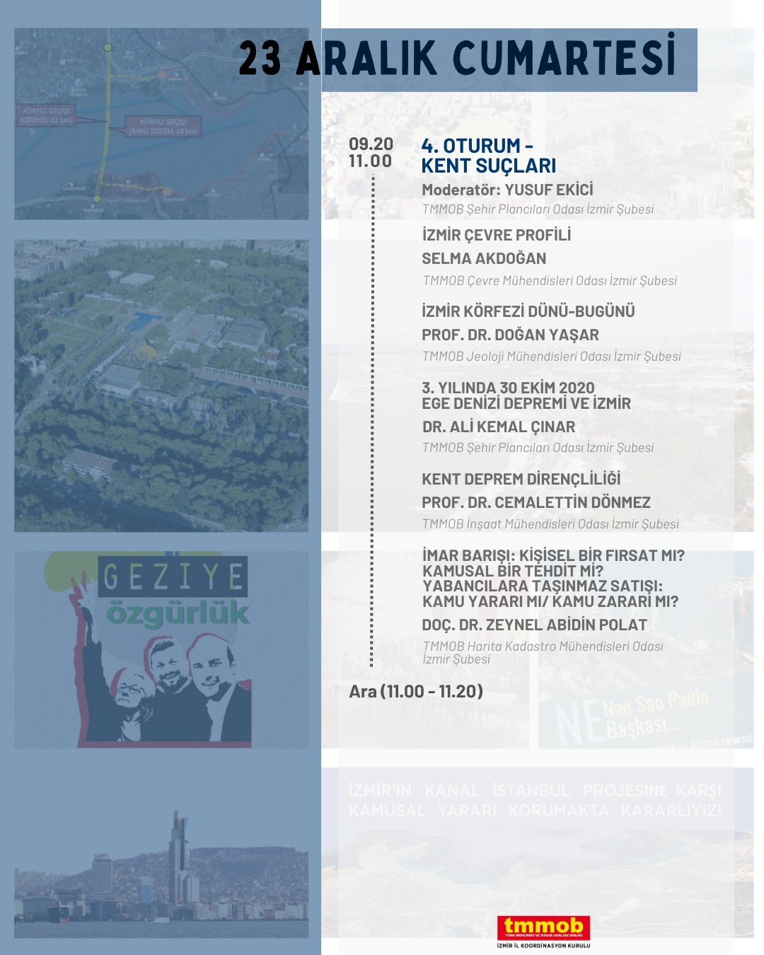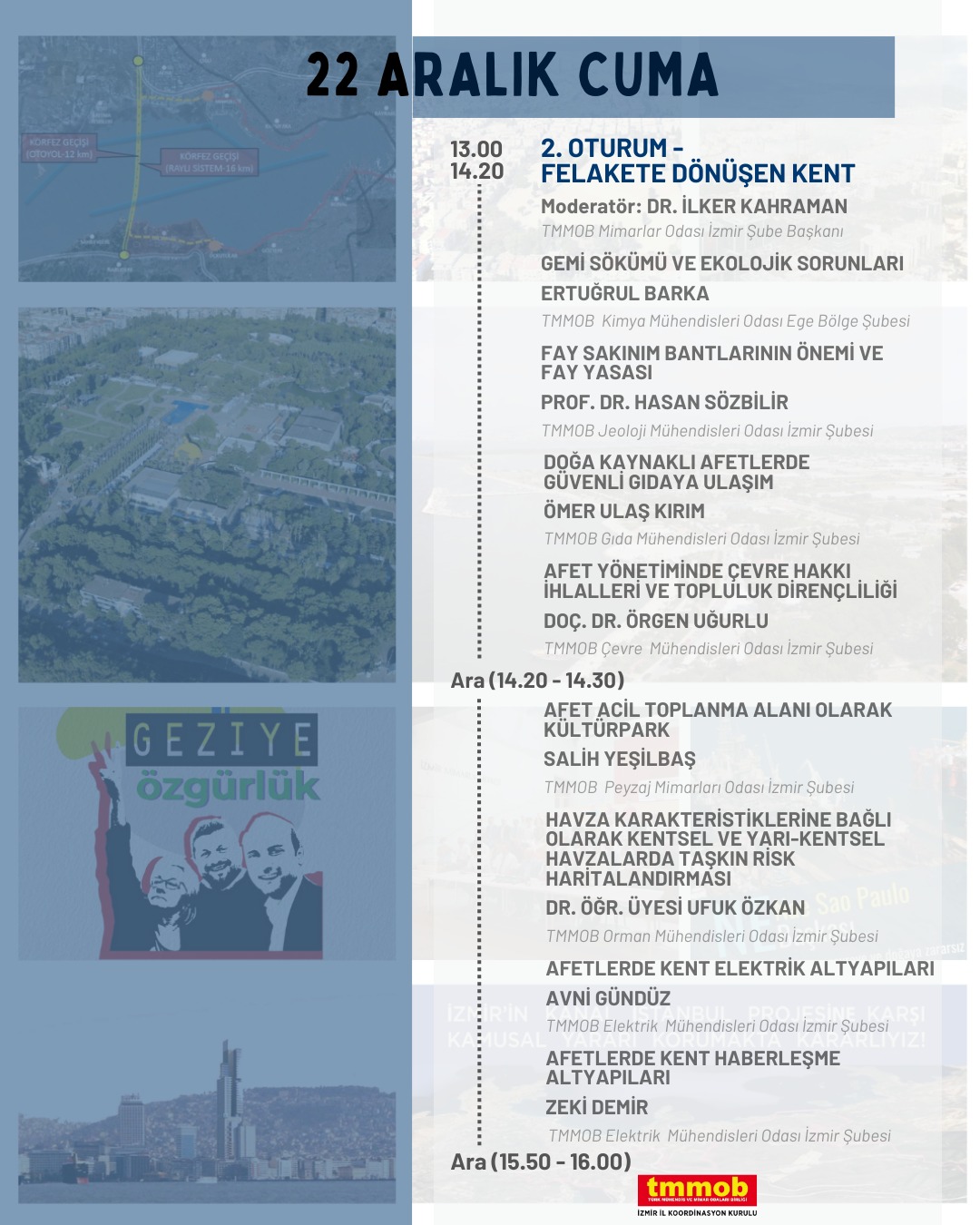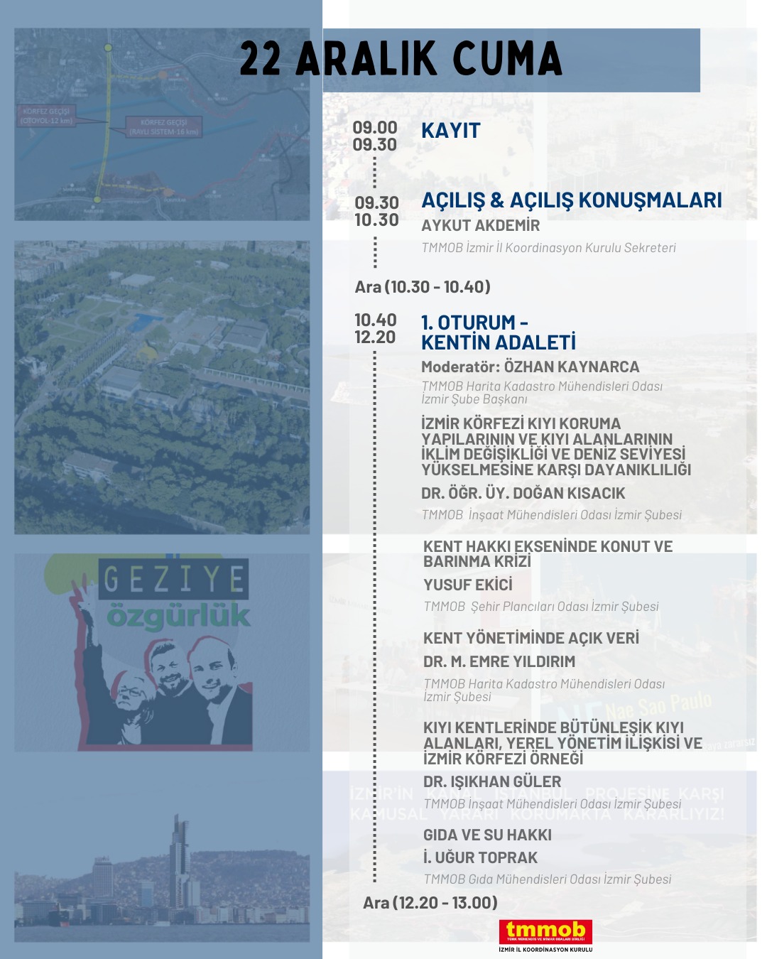 Sağlıklı, güvenli ve adil yaşam haklarımız için kent mücadelesini yürüten TMMOB'ye bağlı meslek odalarının kentlerimizin mevcut durumu, kent planlaması ve yönetimi, afetler, kent suçları ve adaleti konulu sunum ve paylaşımlar ile “Nasıl Bir Kent? Nasıl Bir İzmir?” sorusunun yanıtını arayacağı "Direnen Kentlerde Adalet ve Demokrasi" başlıklı sempozyuma tüm halkımızı davet ediyoruz.