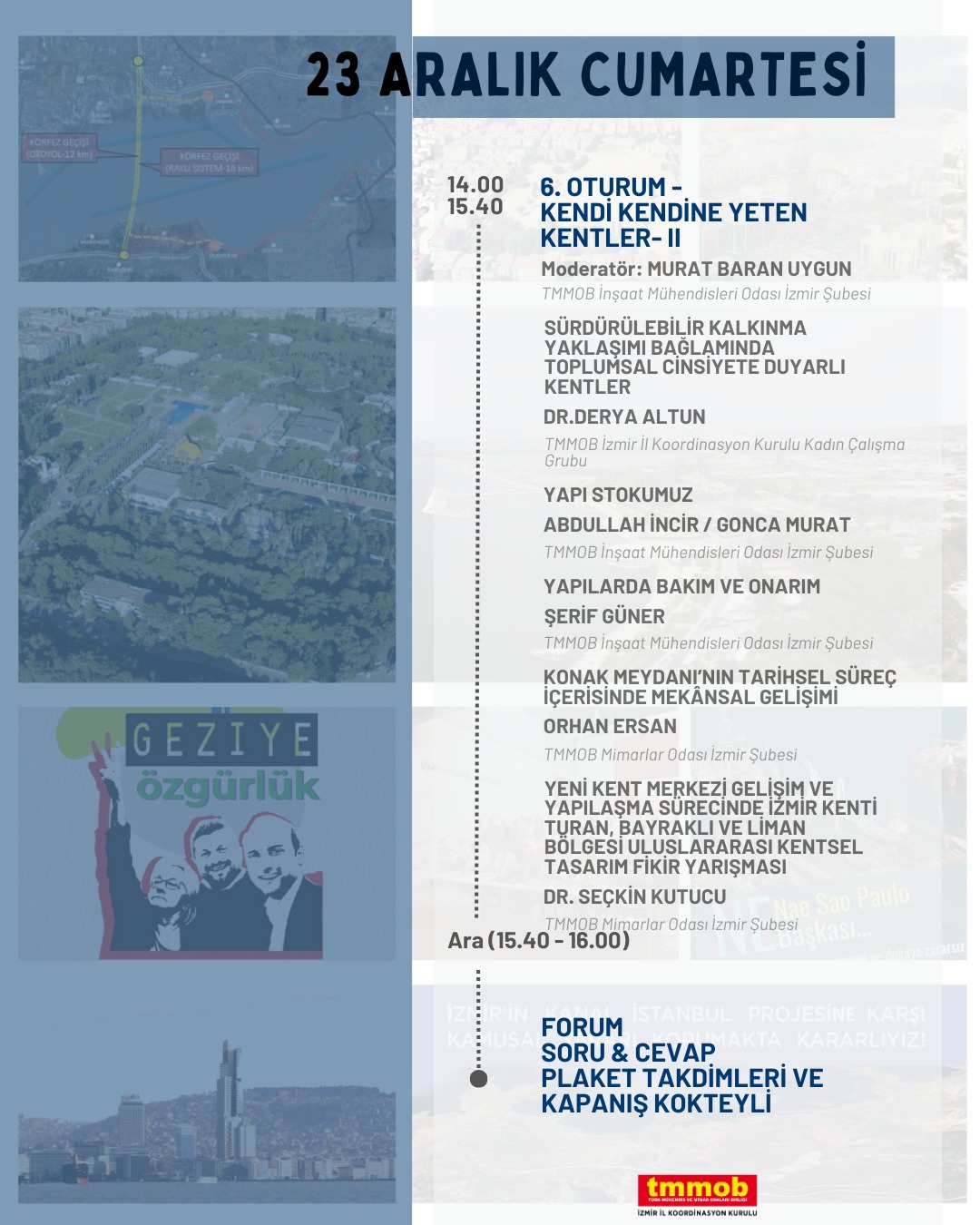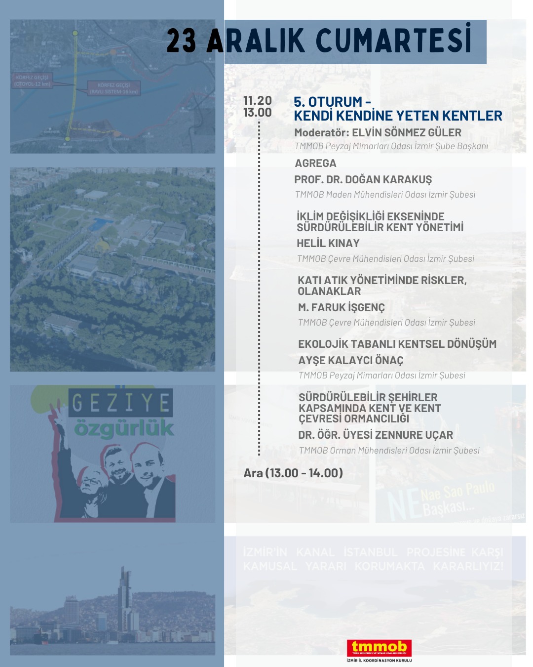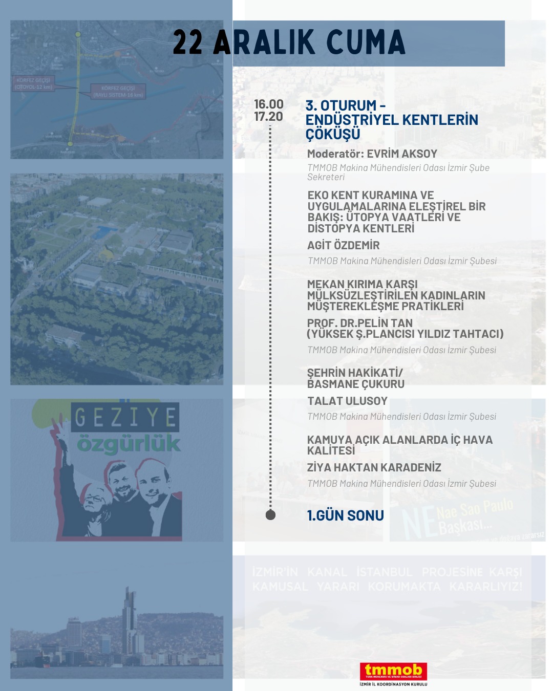 Sağlıklı, güvenli ve adil yaşam haklarımız için kent mücadelesini yürüten TMMOB'ye bağlı meslek odalarının kentlerimizin mevcut durumu, kent planlaması ve yönetimi, afetler, kent suçları ve adaleti konulu sunum ve paylaşımlar ile “Nasıl Bir Kent? Nasıl Bir İzmir?” sorusunun yanıtını arayacağı "Direnen Kentlerde Adalet ve Demokrasi" başlıklı sempozyuma tüm halkımızı davet ediyoruz.