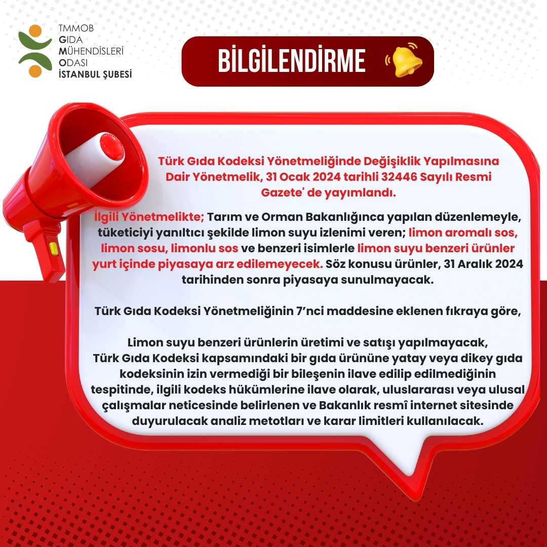 Tarım ve Orman Bakanlığı tarafından Türk Gıda Kodeksi Yönetmeliğinde Değişiklik Yapılmasına Dair Yönetmelik, 31.01.2024 tarih ve 32446 sayılı Resmi Gazete’de yayımlanarak yürürlüğe girmiştir. Söz konusu yönetmeliğe aşağıdaki bağlantıdan ulaşabilirsiniz.