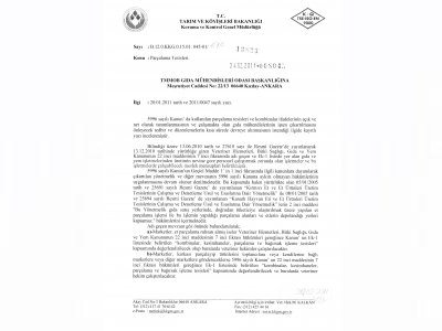 5996 sayılı kanun gerekçe gösterilerek kombina ve parçalama tesislerinde çalışan gıda mühendislerinin işten çıkarılmasına ilişkin 20.01.2011 tarihinde Tarım ve Köyişleri Bakanlığı Koruma ve Kontrol Genel Müdürlüğü‘ne iletilen görüşlerimizin bulunduğu resmi yazı aşağıdaki gibidir.
