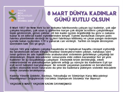 Geçen 165 yıla rağmen çalışma hayatında ve toplumsal hayatta cinsiyet eşitsizliği hız kesmeksizin devam ediyor, İstanbul Sözleşmesi`nden çıkılan, nafakaya süre sınırı getiren ve aile hukukunda arabuluculuk sisteminin getirilmeye çalışıldığı bir dönemdeyiz. Büyük mücadeleler sonucunda elde edilen kazanımlar her yıl yeni hamleler ile içi boşaltılmaya çalışılıyor. Ekonomik krizin derinleştiği, emek sömürüsünün ve yoksulluğunun giderek arttığı şu süreçte biz kadınların Eşit işe eşit ücret talepleri karşılanmıyor. İki senedir yaşanılan pandemi ve beraberinde girilen ekonomik krizin faturasını da yine biz kadınlara yükleyen sistemle mücadele etmek zorunda bırakılıyoruz.