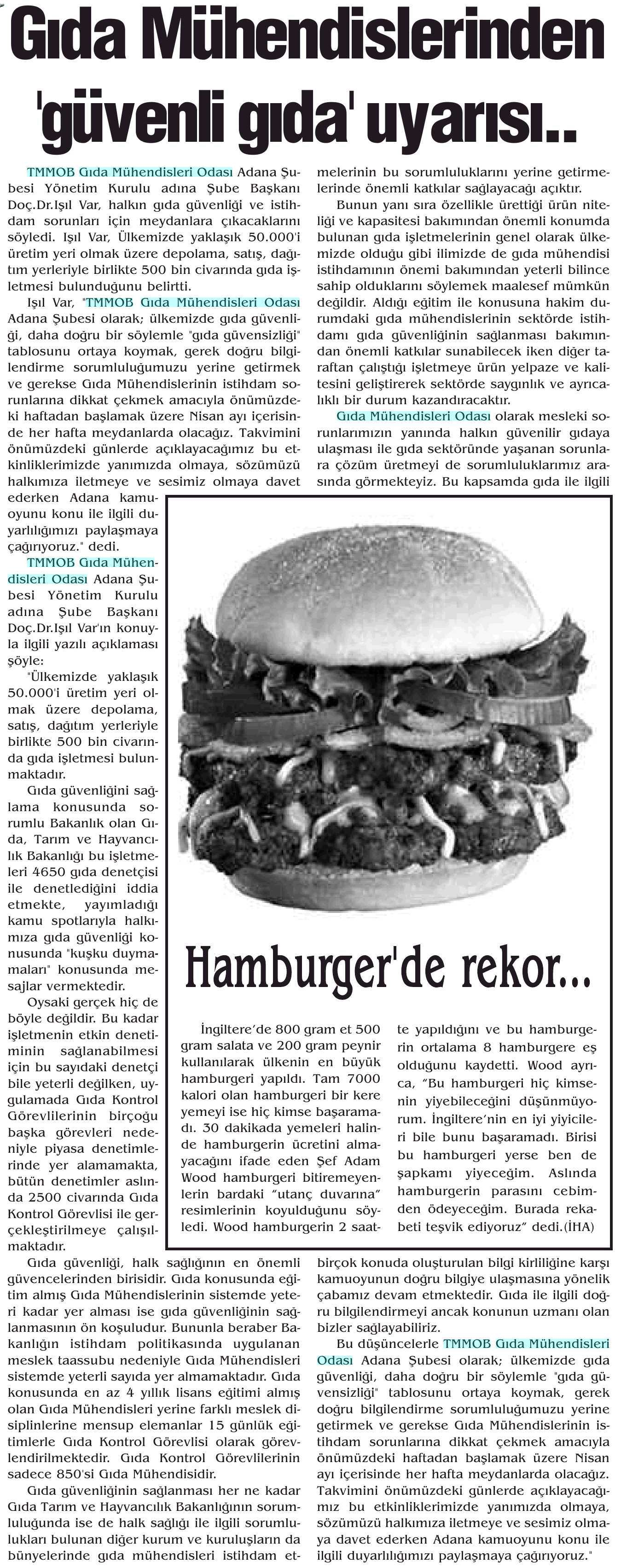 "GIDA MÜHENDİSLERİ`NDEN `GÜVENLİ GIDA` UYARISI" - YENİ ADANA