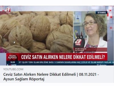 TMMOB Gıda Mühendisleri Odası İstanbul Şube Eğitim Komisyonu Başkanımız Sn. Aysun SAĞLAM, 08 Kasım 2021 Pazartesi günü, AHaber Haber Bülteninde "Sokakta Satılan Cevizler" konusunda bilgilendirmede bulundu.