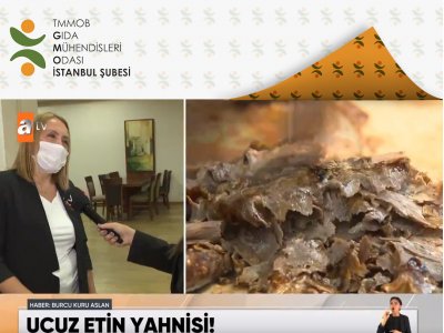 TMMOB Gıda Mühendisleri Odası İstanbul Şubesi Yönetim Kurulu 2.Başkanımız Sn. Aydan DALBASTI`nın "Et Dönerde Yapılan Hileler" hakkında bilgilendirmede bulunduğu röportajı 09.10.2020 tarihinde Atv Ana Haber bülteninde yayınlanmıştır.