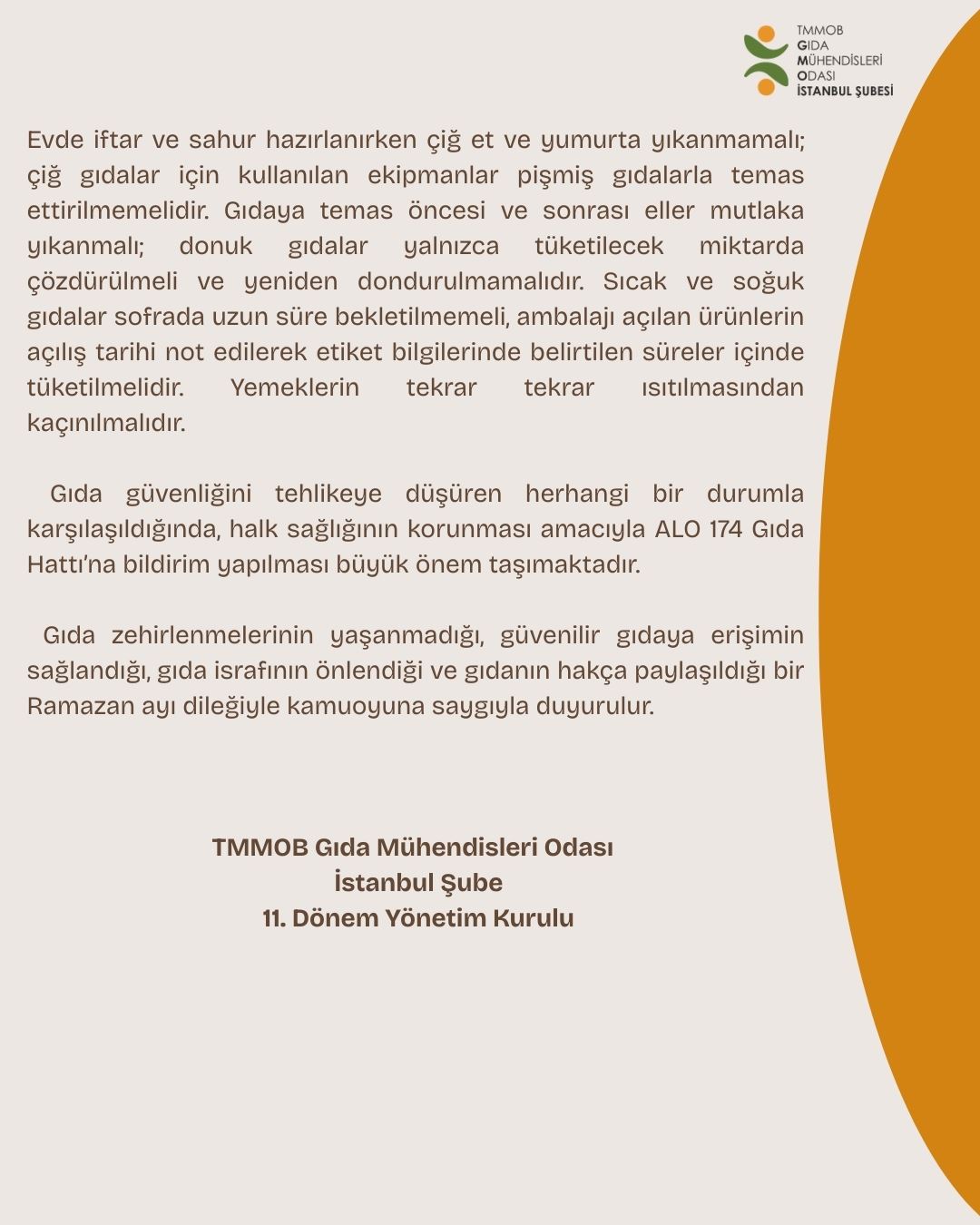 Gıda zehirlenmelerinin yaşanmadığı, güvenilir gıdaya erişimin sağlandığı, gıda israfının önlendiği ve gıdanın hakça paylaşıldığı bir Ramazan ayı dileğiyle kamuoyuna saygıyla duyurulur.