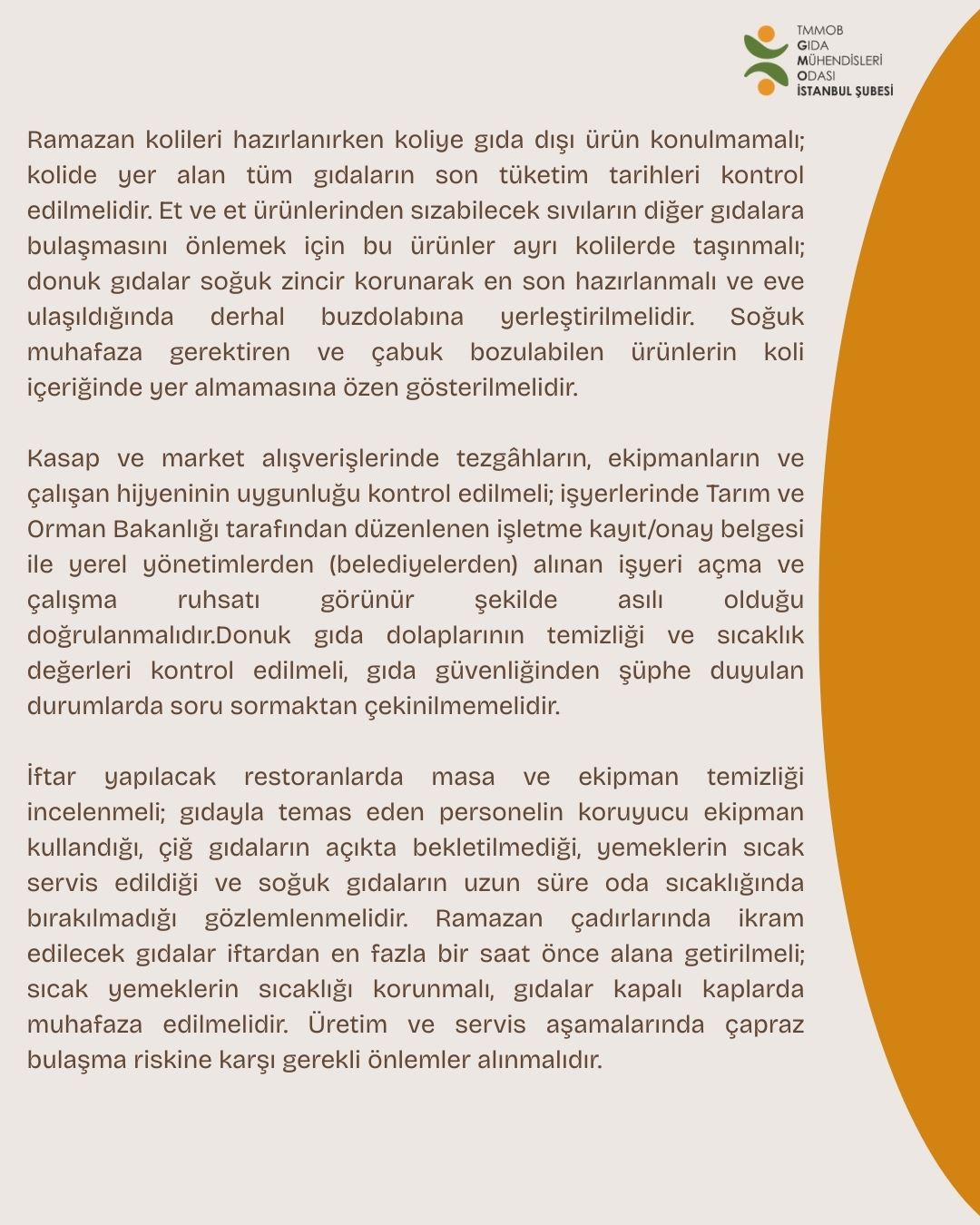 Ramazan ayında toplu tüketimin artmasıyla birlikte gıda zehirlenmesi vakalarında da artış yaşanabilmektedir. Okullar, yurtlar, hastaneler, kamu kurumları ve iftar çadırları gibi toplu tüketim alanlarında denetimler artırılmalı; gıda üretimi ve sunumu gıda mühendisleri gözetiminde gerçekleştirilmelidir. Bu kapsamda Tarım ve Orman Bakanlığı denetim sıklığını artırmalı, yerel yönetimler sorumluluklarını yerine getirmeli; Sağlık Bakanlığı gıda zehirlenmesi vakalarını titizlikle izlemelidir.