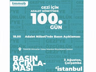 Gezi Davasında verilen hukuksuz kararlar ile tutuklanan TMMOB Yönetim Kurulu üyesi Mücella Yapıcı, Şehir Plancıları Odası Onur Kurulu üyesi Tayfun Kahraman ve Mimarlar Odası avukatı Can Atalay ile diğer tutuklu yurttaşlarımız için yürütülen Adalet Nöbetinin 100. Gününde sesimizi yükseltiyoruz.