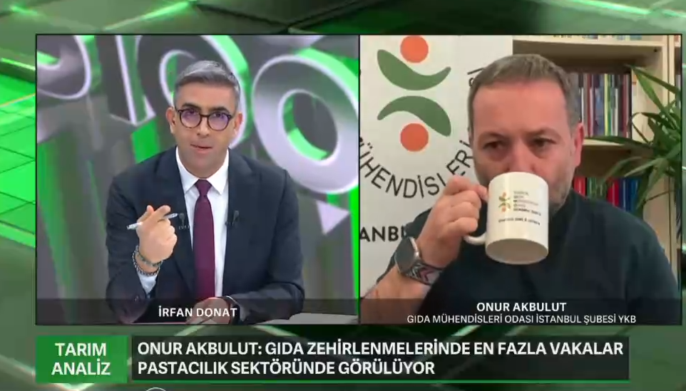 TMMOB Gıda Mühendisleri Odası İstanbul Şubesi Yönetim Kurulu Başkanımız Onur Akbulut, 19 Kasım 2025 tarihinde Bloomberg HT ekranlarında yayımlanan Tarım Analiz programına konuk olarak, program sunucusu İrfan Donat’ın sorularını yanıtlamıştır. Kamuoyunda son dönemde sıkça tartışılan “Gıda Zehirlenmeleri” konusunda önemli değerlendirmelerde bulunmuştur.