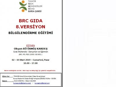 TMMOB Gıda Mühendisleri Odası Bursa Şubesinde 02 - 03 Mart 2019 Cumartesi - Pazar günü gerçekleştirilecek olan iki günlük BRC GIDA 8.VERSİYON Bilgilendirme Eğitimi hakkında ayrıntılar aşağıda verilmiştir.