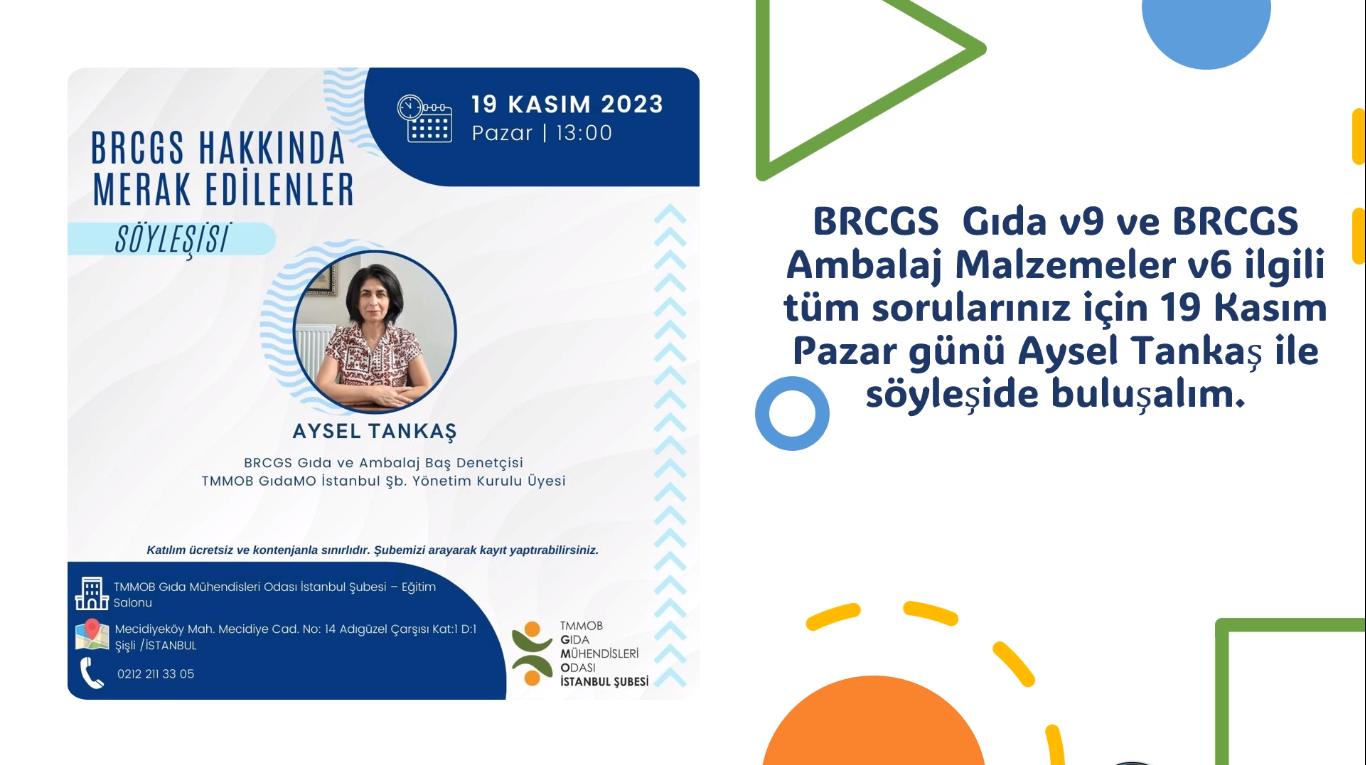 TMMOB Gıda Mühendisleri Odası İstanbul Şubemizde 19 Kasım 2023 Pazar günü saat 13.00`da, ücretsiz olarak gerçekleştirilecek olan "BRCGS Hakkında Merak Edilenler " konulu söyleşimiz hakkında ayrıntılar aşağıda verilmiştir. Katılımlarınızı bekleriz.