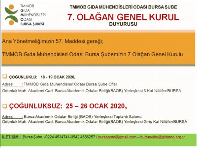 TMMOB Gıda Mühendisleri Odası Bursa Şube 7.Olağan Genel Kurulu, 25-26 Ocak 2020 tarihlerinde, Bursa Akademik Odalar Birliği (BAOB) Yerleşkesi Nilüfer/BURSA, adresinde gerçekleşecektir.