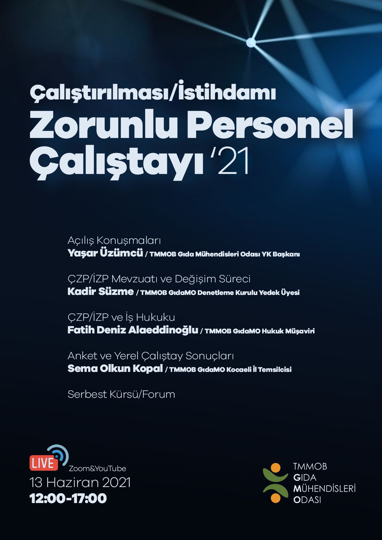 13 Haziran 2021 tarihinde 5996 sayılı kanun kapsamında İstihdamı/Çalıştırılması Zorunlu Personel olarak çalışan üyelerimizin çalışma koşullarını, ücretlerini ve yetkilerini tartıştığımız, hep birlikte çözüm önerileri ürettiğimiz Çalıştırılması Zorunlu Personel Çalıştayı`nı Odamızın youtube kanalı üzerinden canlı olarak gerçekleştirdik.