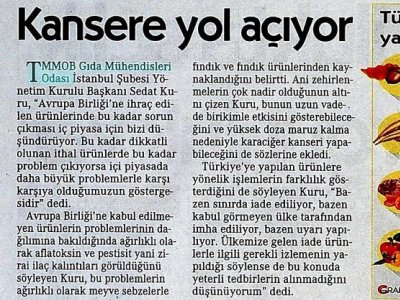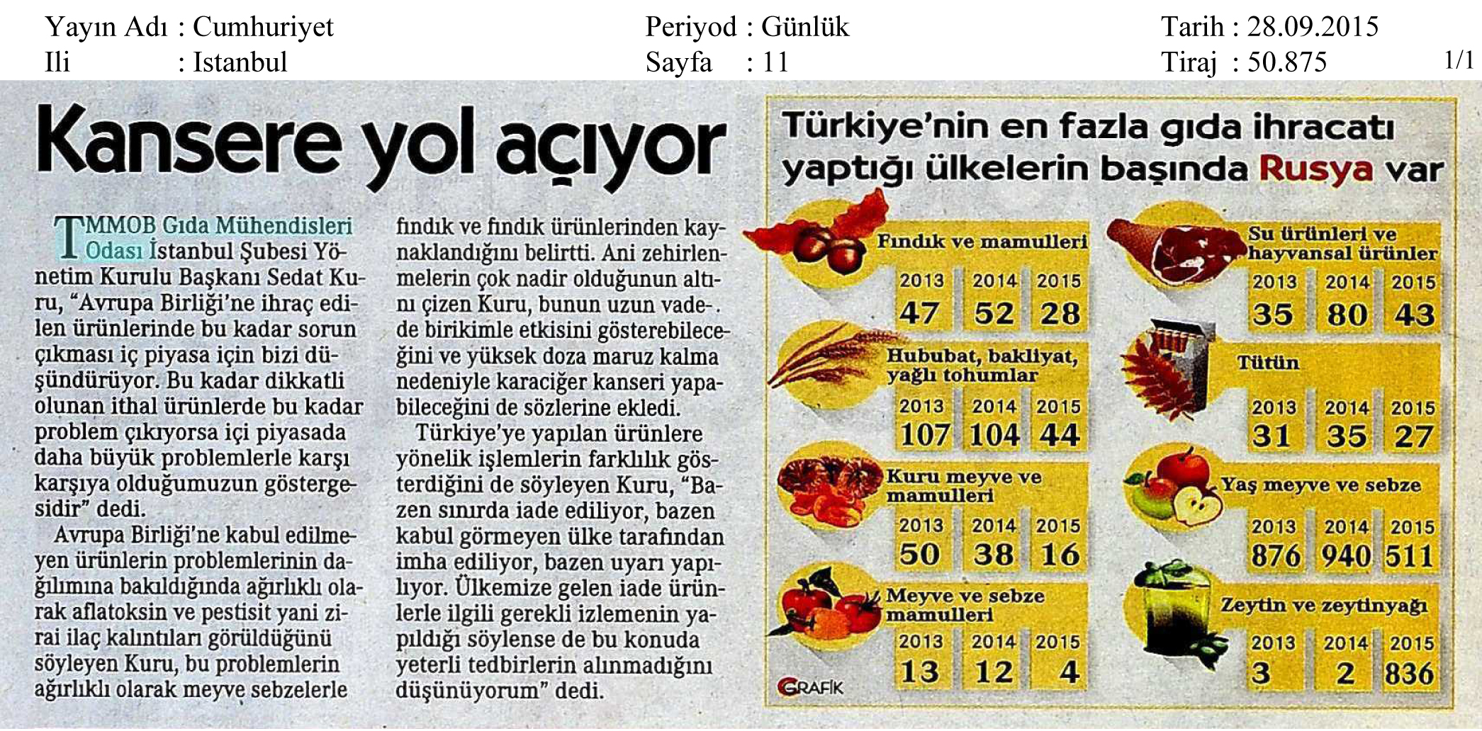 TMMOB Gıda Mühendisleri Odası İstanbul Şube Yönetim Kurulu Başkanımız Sayın Sedat KURU‘nun "Kansere Yol Açıyor" başlıklı yazısı 28.09.2015 tarihinde Cumhuriyet Gazetesinde yayınlanmıştır.