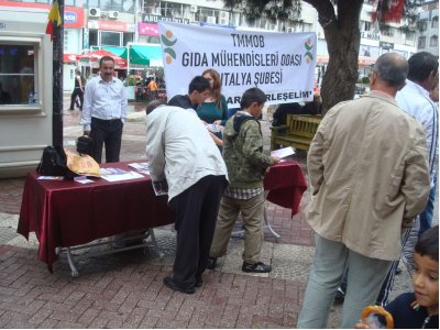 16 Ekim Dünya Gıda Günü etkinlikleri çerçevesinde odamız üyeleriyle ve öğrenci üyelerimizle birlikte görev başındaydık. Bunun için Atatürk İlköğretim Okulunda 3. sınıf öğrencilerine bilinçli gıda tüketimi ile ilgili olarak bilgi verildi ve broşür dağıtıldı. Aynı gün içersinde Akdeniz Üniversitesi Yemekhanesi önünde üniversite öğrencilerine, öğretim üyeleri ve görevlilerine bilinçli gıda tüketimi ile ilgili bilgi verilip dünya üzerindeki bir milyar aç insan yararına FAO tarafından düzenlenen kampanya için imza toplandı. 16. Ekim 2010 tarihinde ise kazım Özalp Cad. kapalı yolda stand açılarak halkın bilinçlenmesi amacıyla bilinçli gıda tüketimi ile ilgili BGT broşürleri dağıtılarak FAO nun bir milyar aç insan yararına düzenlemiş olduğu kampanya için imza toplandı.