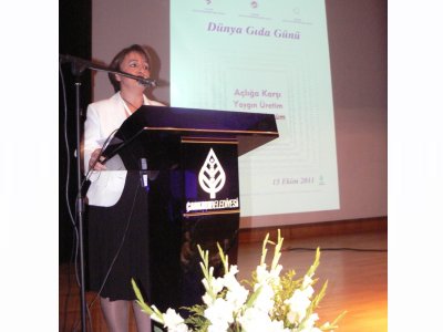 Üç oda başkanı adına açılış konuşmasını yapan Oda Başkanımız Petek ATAMAN; dünya nüfusunun yaklaşık %13‘ünün kronik açlıkla mücadele ettiğini, yeryüzünde 1 milyar aç insan olduğunu söyledi. Son 60 yılda 4 milyar dolayında artan dünya nüfusunun, çevre sorunları ve iklim değişikliği gibi birçok olumsuz etmene rağmen bu toprakların hala bu nüfusu besleyebileceğini belirtti. Açlığın önlenebilmesi için yaygın tarımsal üretimin sürdürülebilirliğinin sağlanacağı politikalar eşliğinde kısa ve uzun vadedeki tarımsal üretim öncelikleri belirlenmesi, bölüşümün adaletli olması gerekliliğine dikkat çekti.