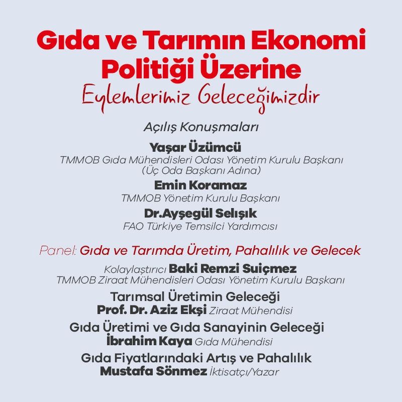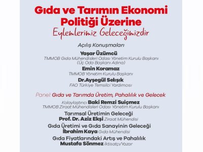 Sunuculuğunu Yönetim Kurulu Y.Üyemiz Gülten Kolcuoğlu‘nun üstlendiği, "Gıda ve Tarımın Ekonomi Politiği Üzerine Eylemlerimiz Geleceğimizdir" ana teması ile 16 Ekim 2021 Cumartesi günü, 14:00–16:30 saatleri arasında, TMMOB Gıda Mühendisleri Odası YouTube kanalı üzerinden canlı yayınla gerçekleştirdiğimiz Dünya Gıda Günü Sempozyumu‘nda; açılış konuşmalarını 3 Oda adına Yönetim Kurulu Başkanımız Yaşar Üzümcü, TMMOB Yönetim Kurulu Başkanı Emin Koramaz ve FAO Türkiye Temsilci Yardımcısı Dr. Ayşegül Selışık gerçekleştirdi. Ardından TMMOB Ziraat Mühendisleri Odası Yönetim Kurulu Başkanı Remzi Baki Suiçmez‘in Kolaylaştırıcı olduğu "Gıda ve Tarımda Üretim, Pahalılık ve Gelecek" başlıklı panelinde, Prof. Dr. Aziz Ekşi "Tarımsal Üretimin Geleceği", Gıda Mühendisi İbrahim Kaya "Gıda Üretimi ve Gıda Sanayinin Geleceği" ve İktisatçı/ Yazar Mustafa Sönmez "Gıda Fiyatlarındaki Artış ve Pahalılık" konu başlıklarında sunumlarını gerçekleştirdiler.
