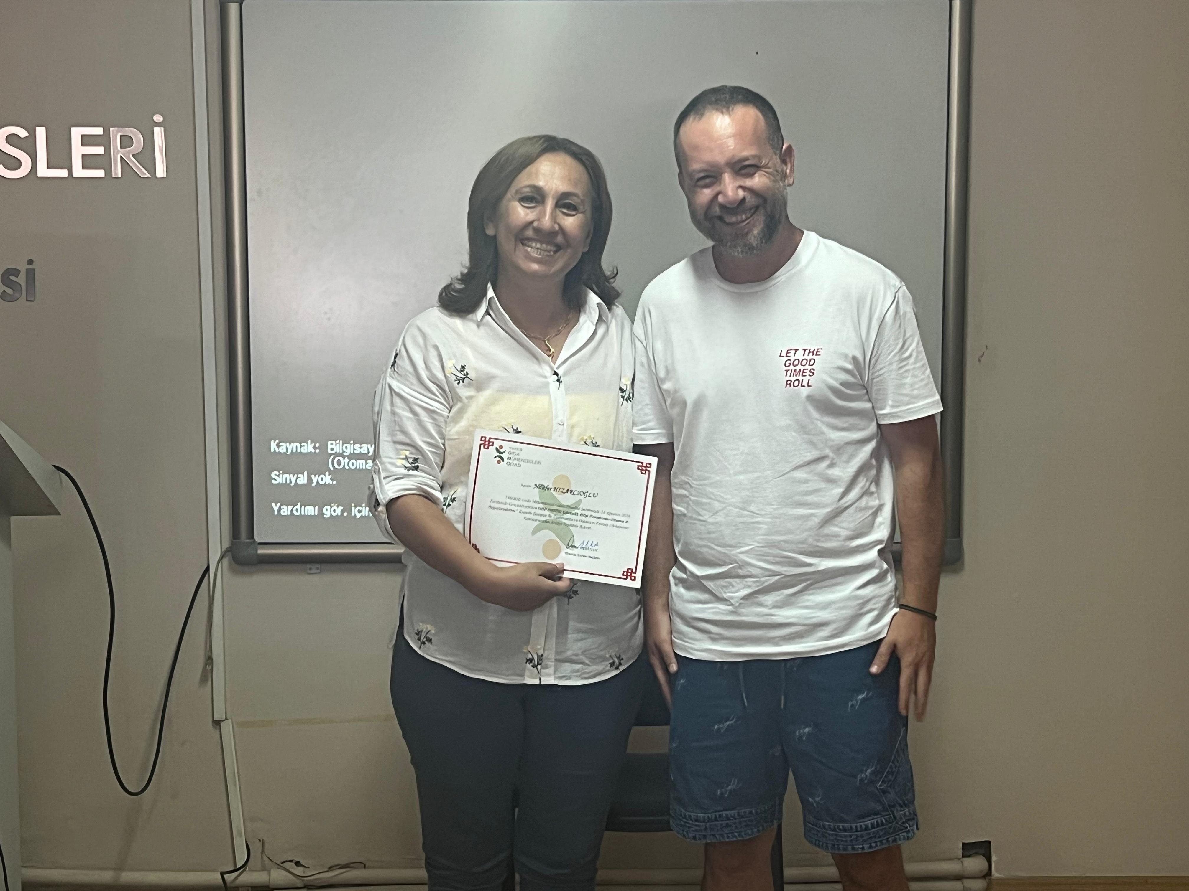 İstanbul Şube Yönetim Kurulu Başkanımız Sn. Onur AKBULUT Seminerin Eğitmenliğini üstlenen Sn. Nilüfer HIZARCIOĞLU’na şubemize ve üyelerimize katkılarından dolayı teşekkür belgesi takdim etmiştir.