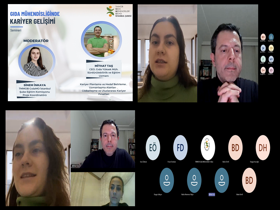 TMMOB Gıda Mühendisleri Odası İstanbul Şubesi olarak, 07 Ocak 2025 tarihinde moderatörlüğünü Eğitim Komisyonu Üyemiz Sinem İNKAYA’ nın yaptığı, oda üyemiz Gıda Yüksek Müh. Sürdürülebilirlik ve Eğitim Uzmanı Sn. Mithat TAŞ’ ın konuşmacı olduğu "Gıda Mühendisliğinde Kariyer Gelişimi" seminerimizi çevrimiçi olarak gerçekleştirdik.