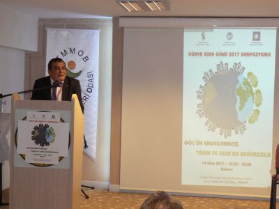 FAO tarafından bu yılın Dünya Gıda Günü teması "Göçün Geleceğini Değiştir: Gıda Güvencesi ve Kırsal Kalkınmaya Yatırım Yap" olarak belirlenmişti. Sempozyum boyunca; Uluslararası veya yurt içinde, gönüllü ya da zorunlu her türlü insan hareketini kapsayan göçün 2000‘li yıllardan bu yana açlık ve yoksulluk gibi ekonomik etkenlerin yanı sıra özellikle dünyadaki savaşların etkisiyle de artarak devam ettiği vurgulandı. Göçmenlerin büyük bir kısmının, geçimin tarım ve doğal kaynaklara dayandığı, dünyanın yoksul ve gıda güvenliğine sahip olmayan %75`lik kesiminin yaşadığı kırsal kesimden gelmekte olduğu, bunun sebebinin de tarımsal üretimde ağırlaşan yaşam koşulları, verim düşüklüğü, pazar bulunamaması, üretimin ulusal planlamayla gerçekleştirilmemesi, tarım ve hayvansal üretimde girdi maliyetlerinin düşürülememesi, kolektif ekipman ve profesyonel üretim modeline geçilmemesi, ekilen toprakların çok parçalı olması, makineli tarımın artması, tarımda insan gücüne olan ihtiyacın azalması, köylerdeki alt yapı ve sosyal hizmetlerin kentlere göre daha az olması ve tarım dışı alanlarda yeterli istihdam imkânlarının bulunmaması olarak tespit edildi. Bu durumun ise kentsel dengeleri bozarak, kentlerde işsiz kitlelerin yığılmasına neden olduğu aktarıldı. Tarımın toplam istihdam içindeki payının 2002 yılında %35 iken bu payın 2011 yılında %25`e, 2016 yılında ise %20`ye gerilediği ifade edilerek, kırsal bölgelerde gıda üretimi ile ilgili sabitlenmiş ekonomik büyüme için geniş bir potansiyel bulunduğu, gelişmekte olan ülkeler için kalkınmanın yolunun kırsaldan geçtiği, bu bölgelerde küçük aile çiftçiliğinin desteklenmesi gerektiğinin altı çizildi. Sivil toplum örgütlerinin temsilcilerinin, akademisyenlerin, meslektaşlarımızın, üyelerimizin ve öğrencilerimiz katıldığı Sempozyum plaket töreniyle son buldu.