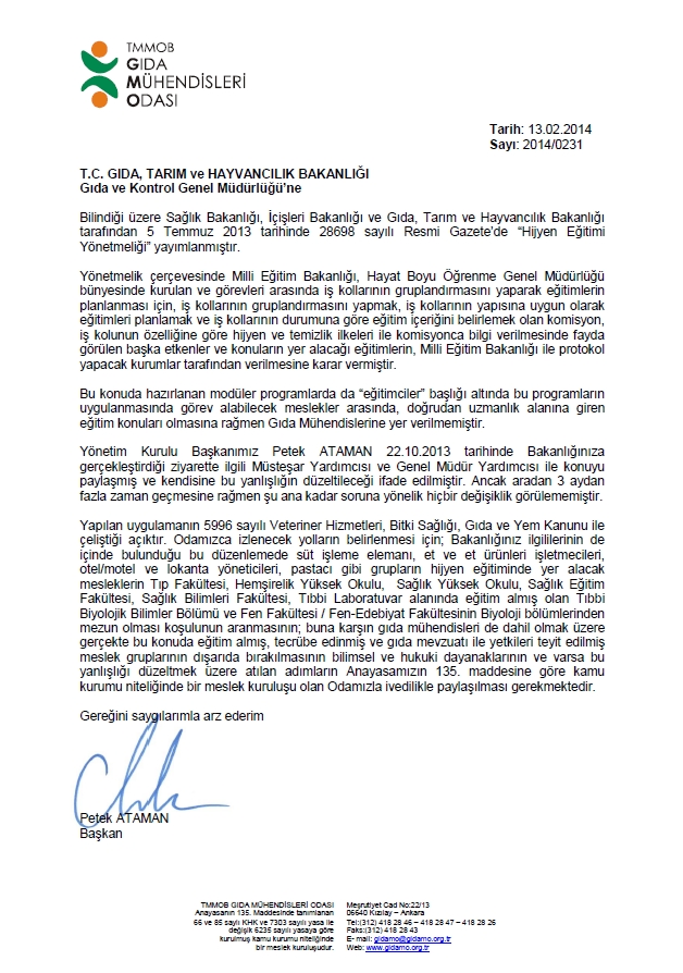 HİJYEN EĞİTİMİ YÖNETMELİĞİ HAKKINDA İLGİLİ BAKANLIKLARLA YAZIŞMALARIMIZ