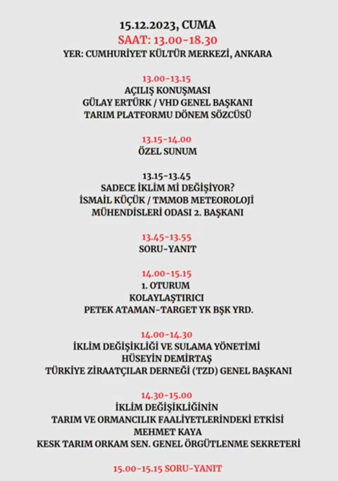 Bileşeni olduğumuz Tarım Platformu tarafından "İklim Değişikliği, İnsanlığın Geleceği" Sempozyumu 15 Aralık 2023 Cuma günü saat 13:00 - 18:30 saatleri arasında gerçekleştirilecektir.