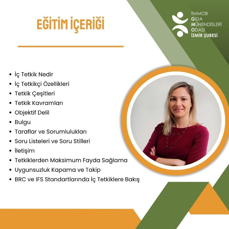 TMMOB Gıda Mühendisleri Odası İzmir Şubesi eğitime yeterli katılım olmaması durumunda, eğitimi iptal etme ve tarihini değiştirme hakkını saklı tutar. Eğitim kesinleştiğinde Şube tarafından katılımcılara duyurulur.