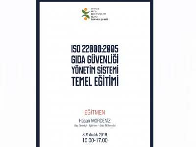 TMMOB Gıda Mühendisleri Odası İstanbul Şubesi`nde 08 – 09 Aralık 2018 Cumartesi - Pazar günleri gerçekleştirilecek olan iki günlük ISO 22000:2005 Gıda Güvenliği Yönetim Sistemi Temel Eğitimi hakkında ayrıntılar aşağıda verilmiştir. Tüm üyelerimizin bilgisine sunulur. Katılımlarınızı bekleriz.