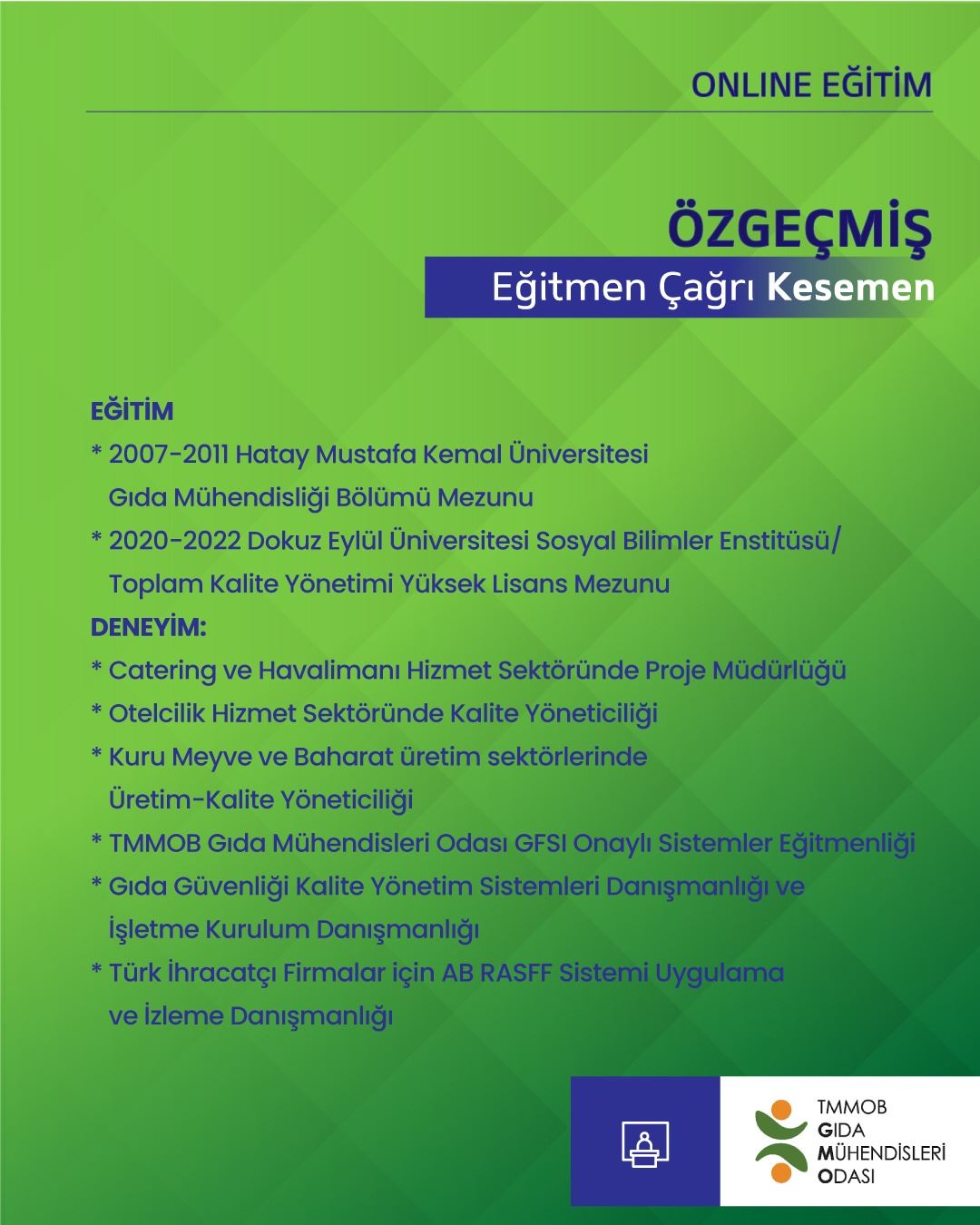 Eğitmen: Çağrı Kesemen-Gıda Mühendisi