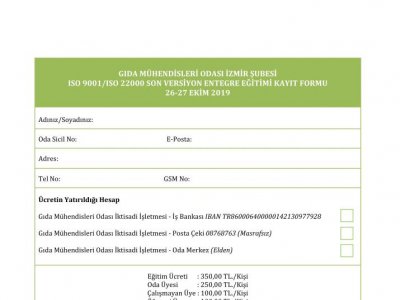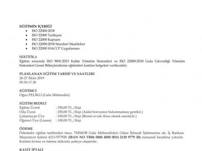 TMMOB Gıda Mühendisleri Odası İzmir Şubesi eğitime yeterli katılım olmaması durumunda, eğitimi iptal etme ve tarihini değiştirme hakkını saklı tutar. Eğitim kesinleştiğinde Oda tarafından katılımcılara duyurulur.