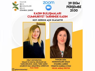 TMMOB Gıda Mühendisleri Odası İstanbul Şubesi Kadın Komisyonu öncülüğünde 29 Ekim 2020 Perşembe günü saat 21.00 da zoom üzerinden "Cumhuriyet Tarihinde Kadın" konulu söyleşimiz gerçekleştirildi.