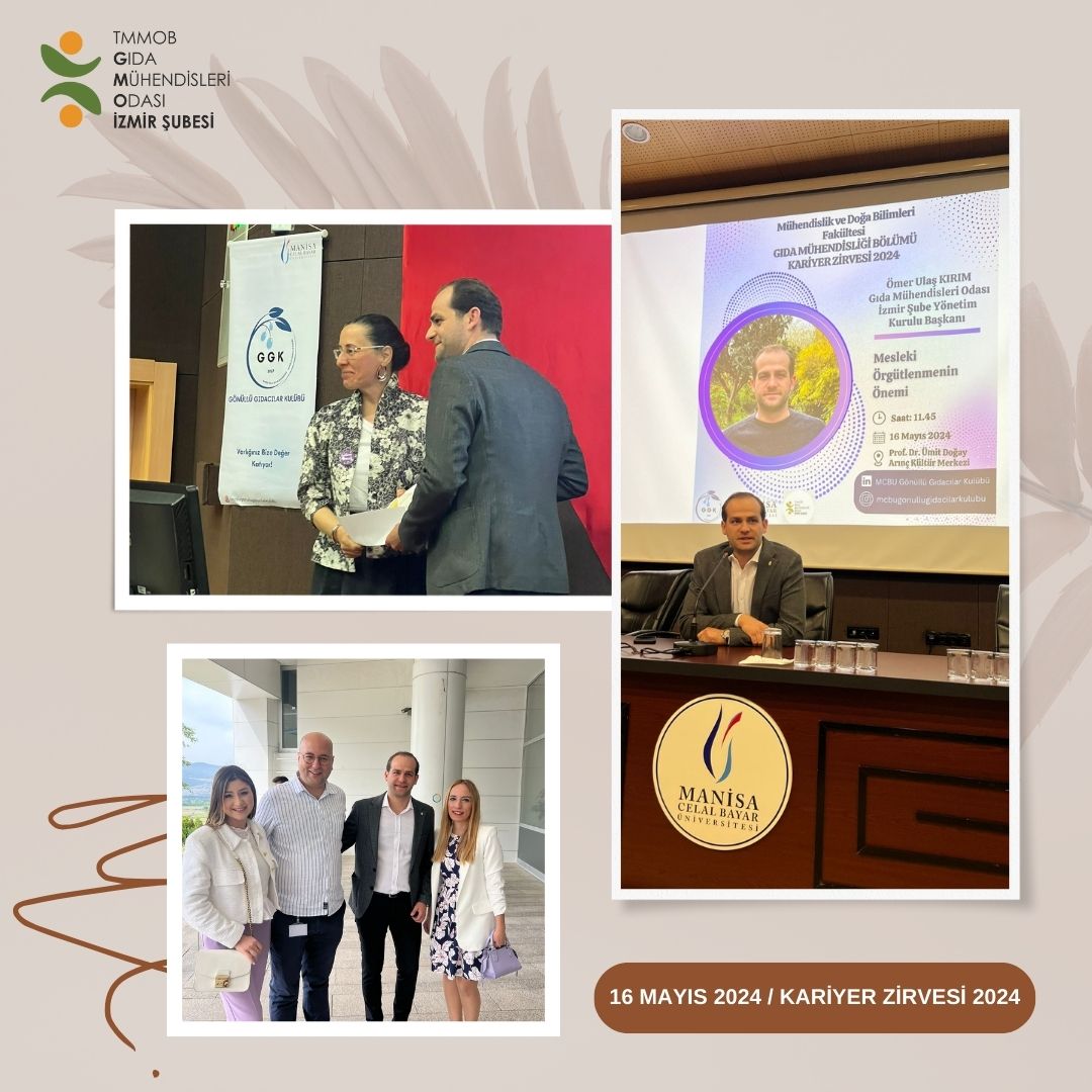 Manisa Celal Bayar Üniversitesi Gıda Mühendisliği Bölümü Endüstriyel İlişkiler ve Kariyer Komisyonu tarafından, 16 Mayıs 2024 Perşembe günü, Prof. Ümit Doğay Arınç Kültür Merkezi'nde gerçekleştirilen Kariyer Zirvesi 2024 etkinliğine katıldık. Etkinlikğe Şubemizi temsilen Yönetim Kurulu Başkanımız Ö. Ulaş KIRIM ve Yönetim Kurulu Yedek Üyemiz Özge KESKİNOĞLU katıldı, Başkanımız "Mesleki Örgütlenmenin Önemi"ni başlıklı sunumunda Odamızı ve mesleğimizi anlattı.