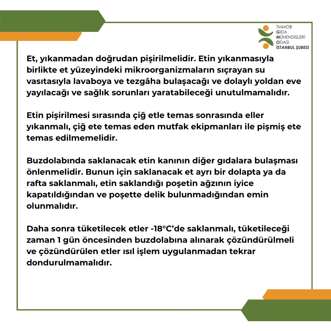 Etin pişirilmesi sırasında çiğ etle temas sonrasında eller yıkanmalı, çiğ ete temas eden mutfak ekipmanlarıyla pişmiş ete temas edilmemelidir.