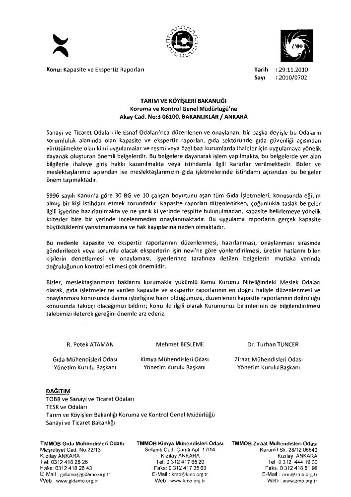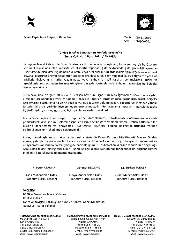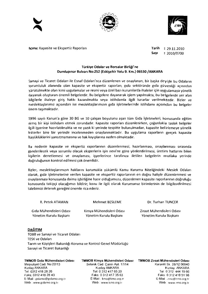 KURUMLARA GÖNDERİLEN İSTİHDAM VE KAPASİTE VE EKSPERTİZ RAPORLARI KONULU RESMİ YAZILARIMIZ