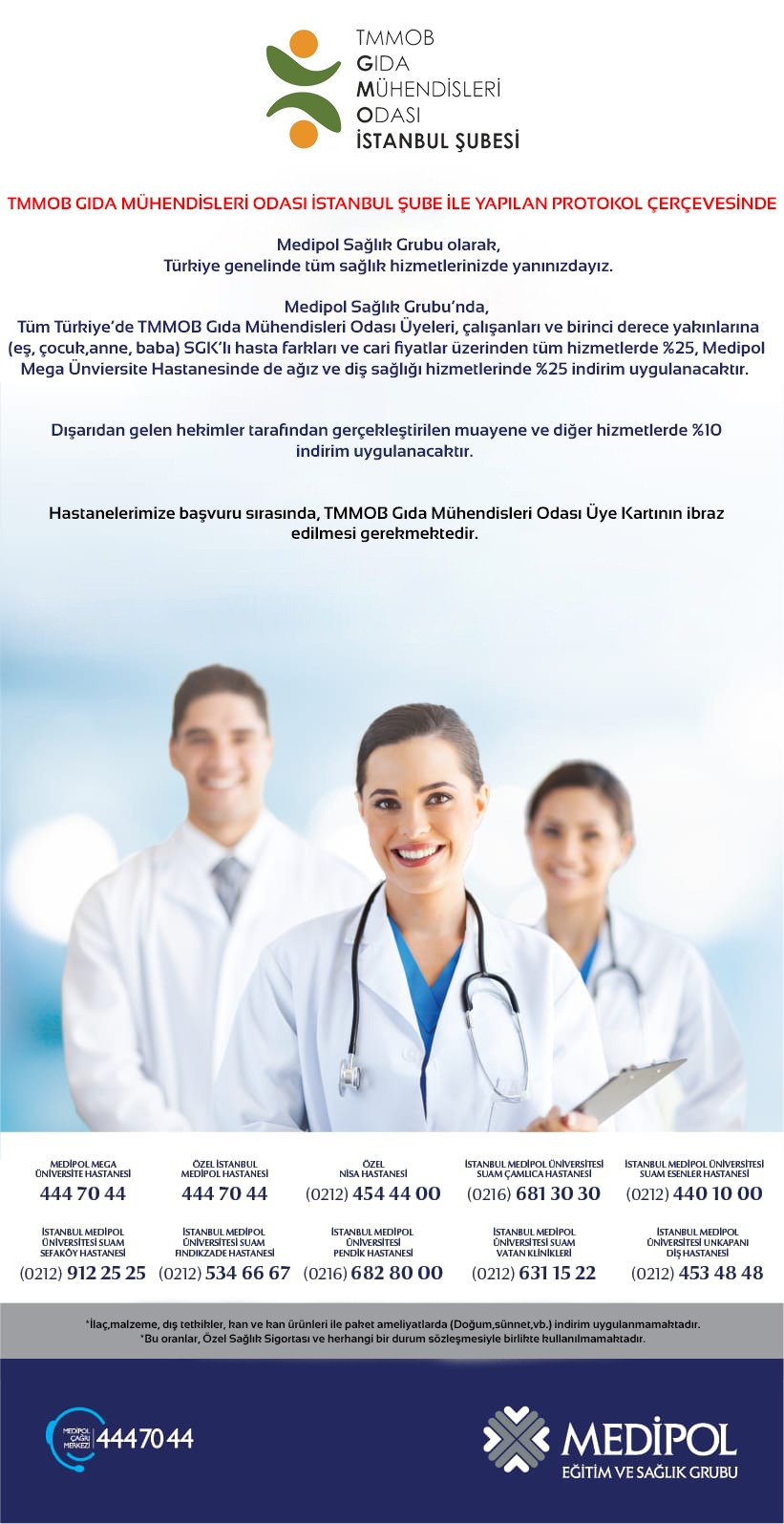 TMMOB Gıda Mühendisleri Odası İstanbul Şubesi olarak yaptığımız protokol doğrultusunda tüm Türkiye genelindeki TMMOB Gıda Mühendisleri Odası üyesi meslektaşlarımız ve onların 1. derecede yakınları Medipol Sağlık Grubu hastanelerinde aşağıdaki görselde belirtilen şartlarda muayene ve tedavi olabileceklerdir.