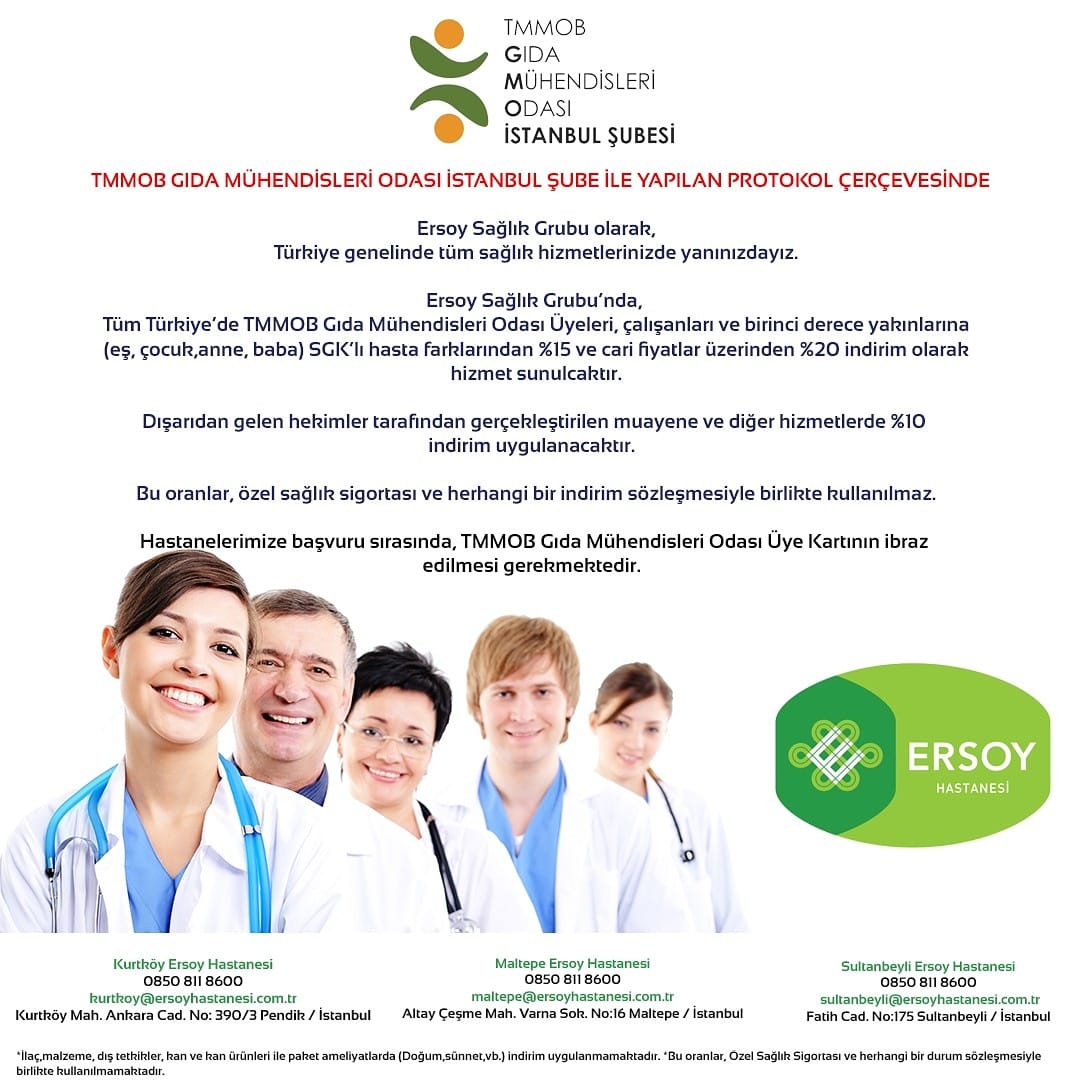TMMOB Gıda Mühendisleri Odası İstanbul Şubesi olarak yaptığımız protokol doğrultusunda tüm Türkiye genelindeki TMMOB Gıda Mühendisleri Odası üyesi meslektaşlarımız ve onların 1. derecede yakınları (eş, çocuk, anne, baba, Kardeş) Ersoy Sağlık Grubu Hastanelerinde aşağıdaki görselde belirtilen şartlarda muayene ve tedavi olabileceklerdir.