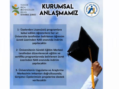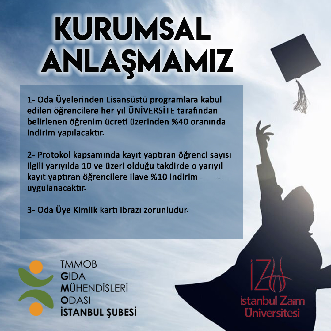 📌 İmzalanan protokol doğrultusunda Türkiye genelindeki TMMOB Gıda Mühendisleri Odamızın üyeleri ve çalışanları, lisansüstü programlara kabul edilen öğrencilere, her yıl üniversite tarafından belirlenen öğrenim ücreti üzerinden %40 oranında indirim yapılacaktır.