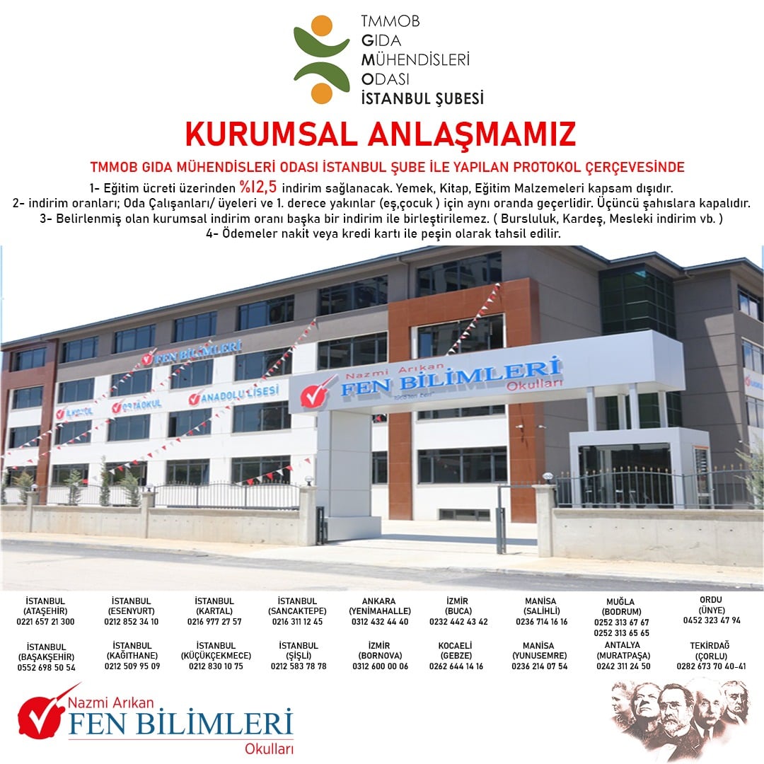 TMMOB Gıda Mühendisleri Odası İstanbul Şubesi olarak, Kurumsal Anlaşmalarımız kapsamında Türkiye genelindeki Nazmi Arıkan Fen Bilimleri Okulları ile 09 Mart ‘21 tarihinde protokol imzalamış bulunmaktayız. İmzalanan protokol doğrultusunda Türkiye genelindeki TMMOB Gıda Mühendisleri Odası üyesi meslektaşlarımızın, onların 1. derecede yakınlarının ve oda çalışanlarımızın çocukları "Nazmi Arıkan Fen Bilimleri Okullar"ndan Anaokulu, İlkokul, Ortaokul ve Lise düzeyinde % 12,5 indirim ile eğitim alabileceklerdir.
