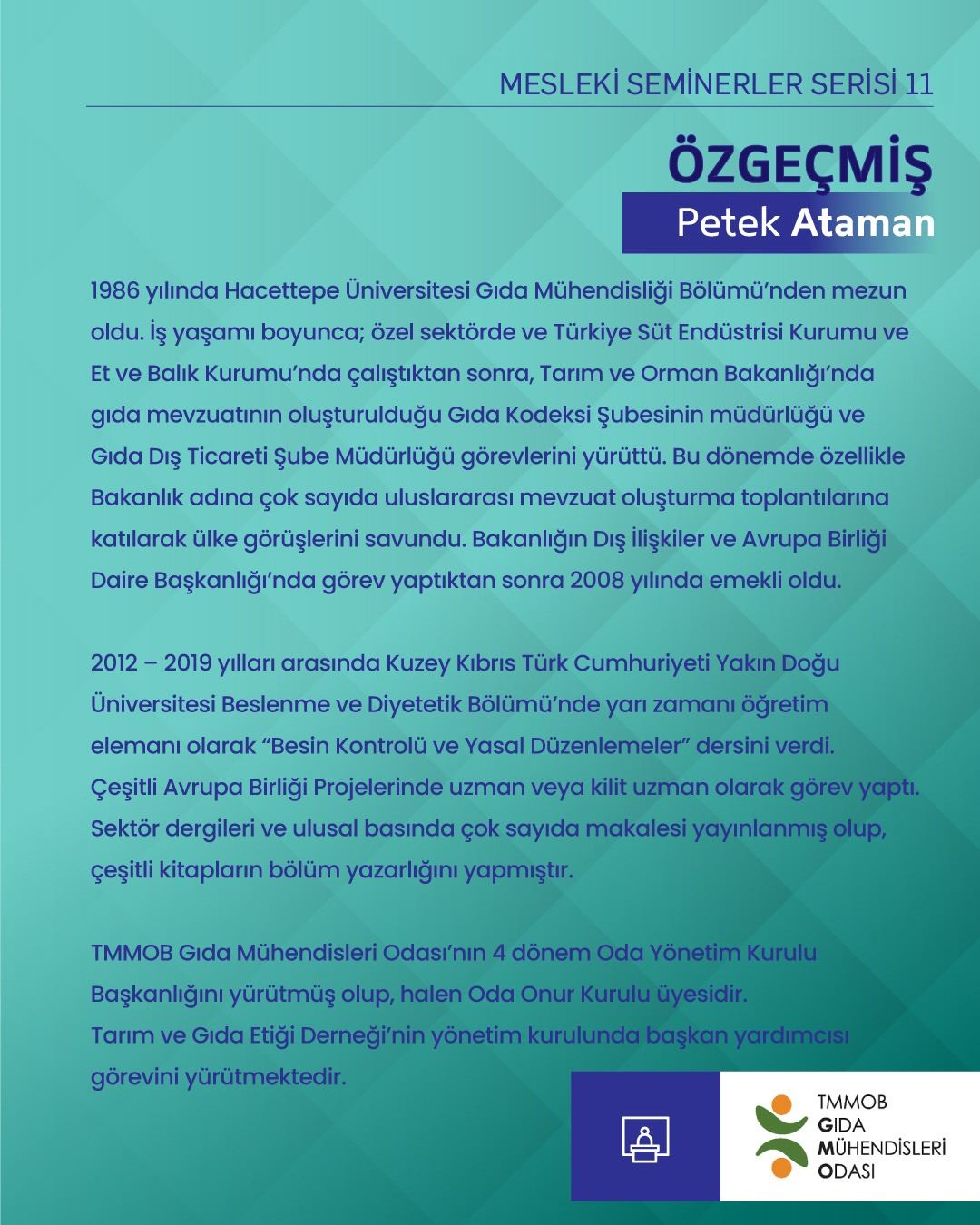 Moderatörlüğünü Eğitim Komisyonu Üyemiz Berçem Hanoğlu’nun yapacağı ve Onur Kurulu Üyemiz Petek Ataman’ın sunumu ile gerçekleştireceğimiz Avrupa Birliği Gıda ve Yem için Hızlı Uyarı Sistemi (RASFF) başlıklı seminerimize tüm üyelerimizin katılımını bekliyoruz.