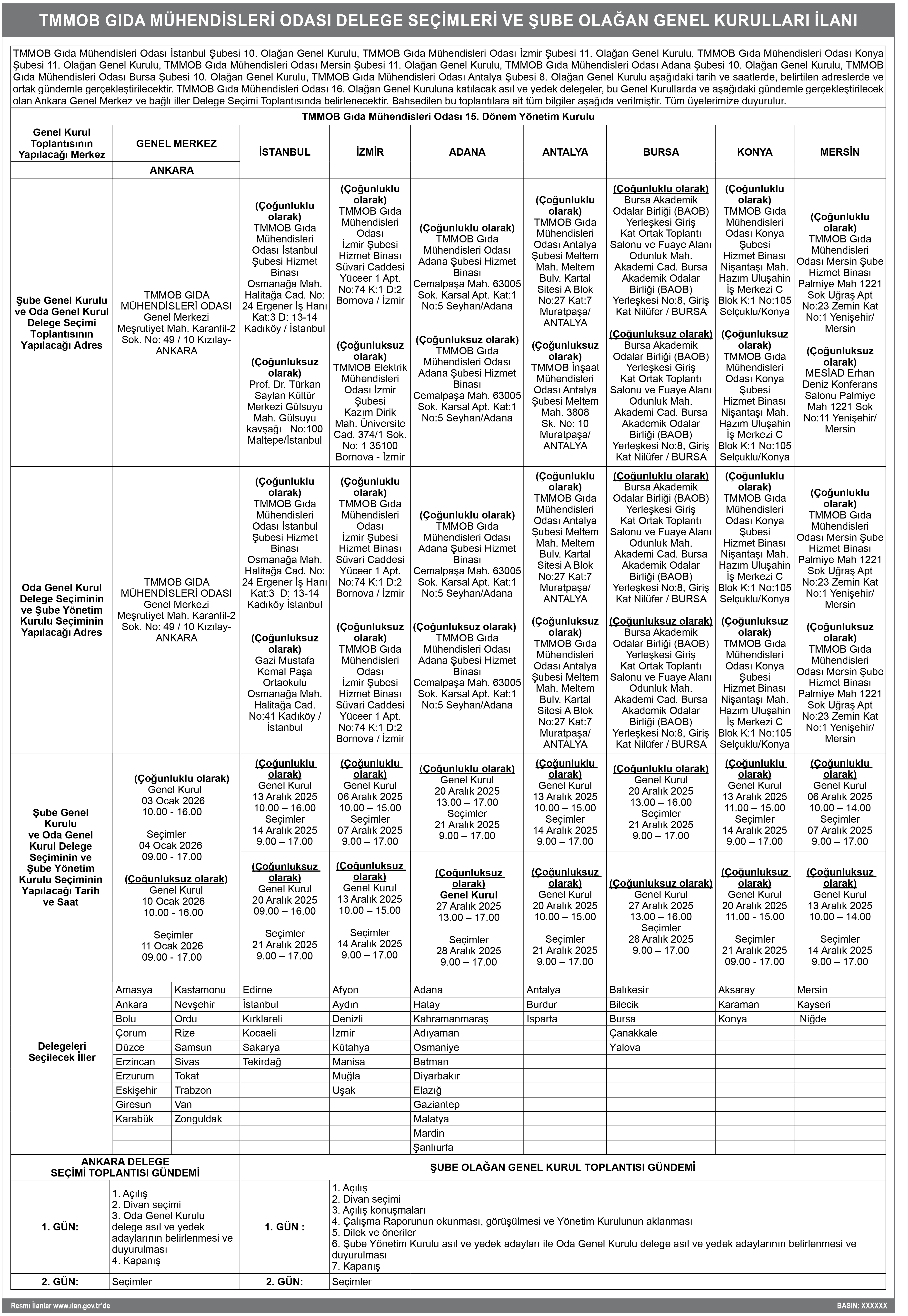 Bu çerçevede Odamız 16. Olağan Genel Kurulu 2026 yılında gerçekleştirilecektir. 16. Olağan Genel Kurula katılacak delege sayıları, Şube Genel Kurul tarihleri ve İl delegelerinin seçileceği seçim bölgeleri belirlenerek aşağıda listelenmiştir.