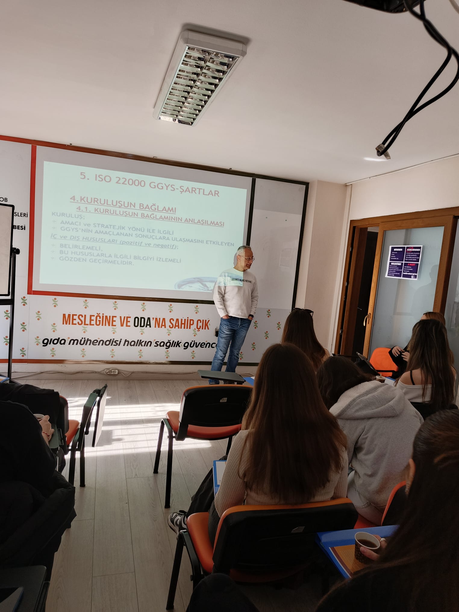 Öğrencilerin temel ve destek eğitimleri Odamız güvencesi ile almaları amacıyla Şubemizin uzun yıllardır devam ettirdiği öğrenci eğitim paketimizin 2026 dönemi eğitimleri yoğun bir katılımla 2 sınıf olarak başladı. 28 Şubat - 1 Mart ve 7-8 Mart tarihlerinde gerçekleşen ilk eğitim, Oda eğitimcimiz Gıda Mühendisi Atıl GEDİK tarafından verilen ISO 22000:2018 GGYS - HACCP eğitimi oldu.
