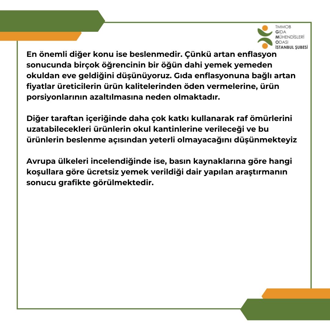 En önemli diğer konu ise beslenmedir. Çünkü artan enflasyon sonucunda birçok öğrencinin bir öğün dahi yemek yemeden okuldan eve geldiğini düşünüyoruz. Gıda enflasyonuna bağlı artan fiyatlar üreticilerin ürün kalitelerinden öden vermelerine, ürün porsiyonlarının azaltılmasına neden olmaktadır.