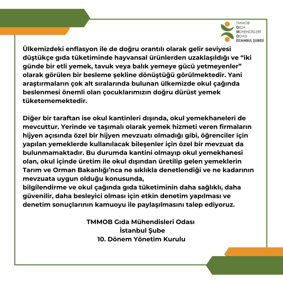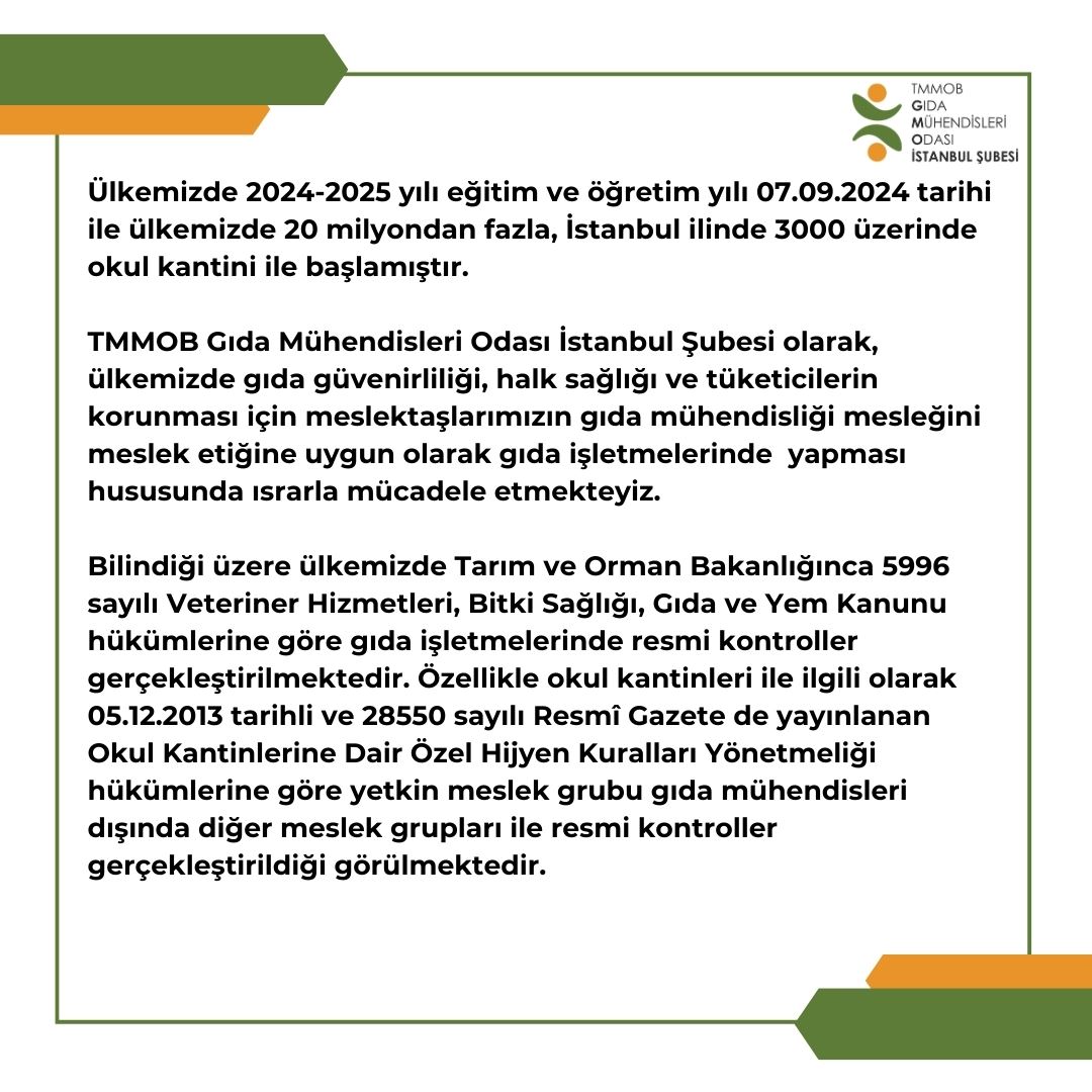 TMMOB Gıda Mühendisleri Odası İstanbul Şubesi olarak, ülkemizde gıda güvenirliliği, halk sağlığı ve tüketicilerin korunması için gıda mühendisliği mesleğini meslek etiğine uygun olarak gıda işletmelerinde meslektaşlarımızın yer alması hususunda ısrarla mücadele etmekteyiz.