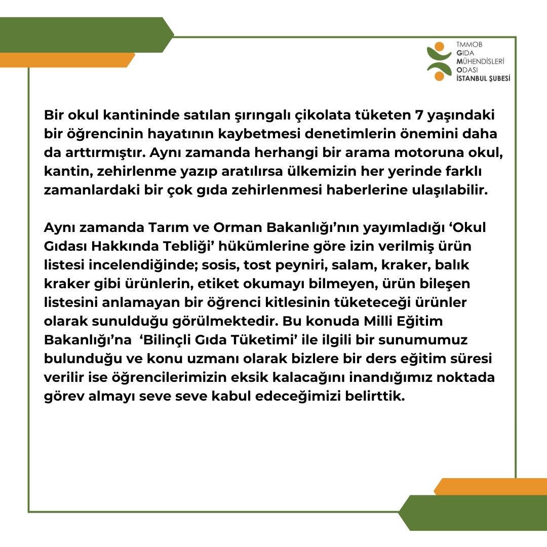bilgilendirme ve okul çağında gıda tüketiminin daha sağlıklı, daha güvenilir, daha besleyici olması için etkin denetim yapılması ve denetim sonuçlarının kamuoyu ile paylaşılmasını talep ediyoruz.
