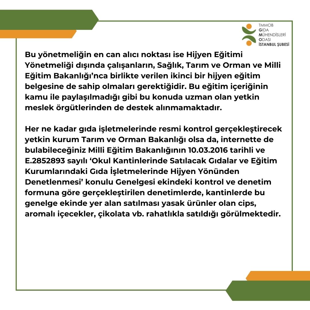 Bu yönetmeliğin en can alıcı noktası ise Hijyen Eğitimi Yönetmeliği dışında çalışanların, Sağlık, Tarım ve Orman ve Milli Eğitim Bakanlığı’nca birlikte verilen ikinci bir hijyen eğitim belgesine de sahip olmaları gerektiğidir. Bu eğitim içeriğinin kamu ile paylaşılmadığı gibi bu konuda uzman olan yetkin meslek örgütlerinden de destek alınmamaktadır.