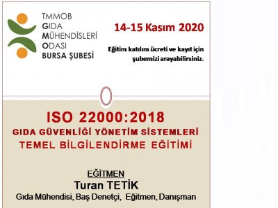 TMMOB Gıda Mühendisleri Odası Bursa Şubesinde 14-15 Kasım 2020 Cumartesi, Pazar günleri gerçekleştirilecek olan iki günlük ONLİNE - ISO 22000:2018 Gıda Güvenliği Yönetim Sistemleri Temel Bilgilendirme Eğitimi hakkında ayrıntılar aşağıda verilmiştir.