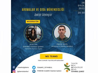 TMMOB GıdaMO İstanbul Şubesi olarak, 28 Eylül 2022 Çarşamba akşam saat 20.30`da Microsoft Teams uygulaması üzerinden çevrimiçi olarak gerçekleştireceğimiz "Aromalar ve Gıda Mühendisliği" konulu Sektör söyleşisi hakkında ayrıntılar aşağıdadır.